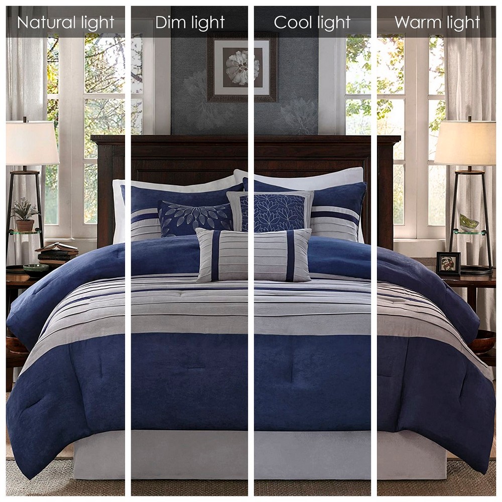 The Madison Park Palmer 7 Piece Comforter Set offers a classic and refined update to your bedroom decor. This transitional style comforter features a pieced microsuede design in rich contrasting blue and grey colors to create an incredibly soft look and feel. The 2 matching shams also flaunt a pieced construction to coordinate with the faux suede comforter. A solid grey bed skirt and 3 decorative pillows with a mix of embroidered designs add the perfect finishing touches to complete this lush traditionally-inspired comforter. Machine washable for easy care, items in the set may come in a rolled or compressed packaging, which will need to be fluffed up or steam ironed before use to remove wrinkles.