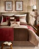 | Madison Park Queen 1 Comforter: 90"W x 90"L 2 Shams: 20"W x 26"L (2) 1 Bedskirt: 60"W x 80"L + 15"D 1 Decorative Pillow: 16"W x 16"L 1 Decorative Pillow: 18"W x 18"L 1 Decorative Pillow: 12"W x 18"L Comforter & Sham: 100% polyester fuax suded fabric pieced color blocks and pintuck on face side with narrow flange,100% polyester brushed fabric back, comforter with 270g/m2 poly fill, sham has overlap opening at back; Bedskirt: 100% polyester fuax suded fabric drop, non-woven fabric platform; Square Pillow: 100% polyester fuax suded fabric cover with pintuck on face and all over piping, poly fill; Oblong Pillow: 100% polyester fuax suded fabric cover with embroidery on face and all over pipi Lodge/Cabin Style Includes 7 Piece(s) Machine wash cold and separately. Tumble dry low. The Jackson Blocks collection combines a casual look with pure comfort. The densely filled comforter and matching shams are made from pieced microsuede that comes together at each seam with pintucking details for added dimension. The large blocks of color bring warmth to the look of the set with deep red, taupe, chocolate brown and ivory colorways while the microsuede gives a soft comforting feel to the top of bed. A brushed fabric back provides a more matte look to the reverse of this cozy set. Three decorative pillows in corresponding colors give small added details to this collection to give it a complete look. Items in the set may come in a rolled or compressed packaging, which will need to be fluffed up or steam ironed before use to remove wrinkles. |