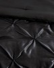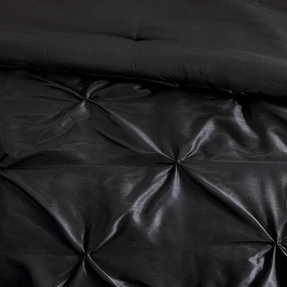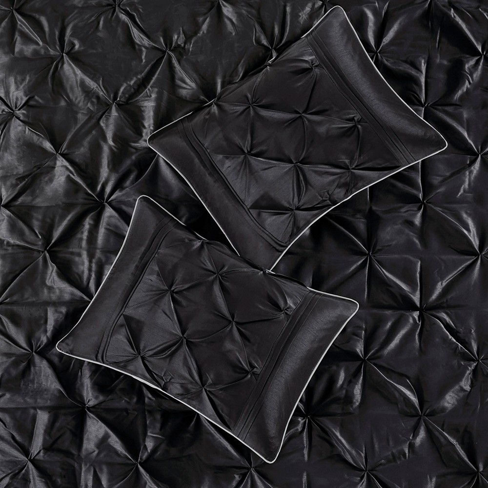 | Madison Park Cal King 1 Comforter: 104"W x 92"L 2 King Shams: 20"W x 36"L (2) 1 Bedskirt: 72"W x 84"L + 15"D 1 Decorative Pillow: 12"W x 18"L 1 Decorative Pillow: 18"W x 18"L 1 Decorative Pillow: D6.5" x 18"L Comforter/Sham: 100% polyester polyoni, pieced, tufted, 100% brushed polyester reverse, 270g/m2 polyester filling Bedskirt: 100% polyester fabric drop, polyester platform Pillow: 100% polyester polyoni cover, polyester filling Transitional Style Includes 7 Piece(s) MACHINE WASH COLD, GENTLE CYCLE, AND SEPARATELY. DO NOT BLEACH. TUMBLE DRY LOW, REMOVE PROMPTLY, DO NOT IRON. IF THERE IS NO FREE MOVEMENT IN THE WASHER OR DRYER, USE LARGE CAPACITY COMMERCIAL WASHER/DRYER. This beautifully tufted bed is from the Laurel Bedding Collection. Its gorgeous, true black color makes this set easy to accessorize your bedroom. The collection is made from 100% polyester polyoni and has pieced fabric sewn together to give this set dimension. It is finished with a smooth edge of fabric that creates a beautiful border around this comforter. Items in the set may come in a rolled or compressed packaging, which will need to be fluffed up or steam ironed before use to remove wrinkles. |