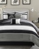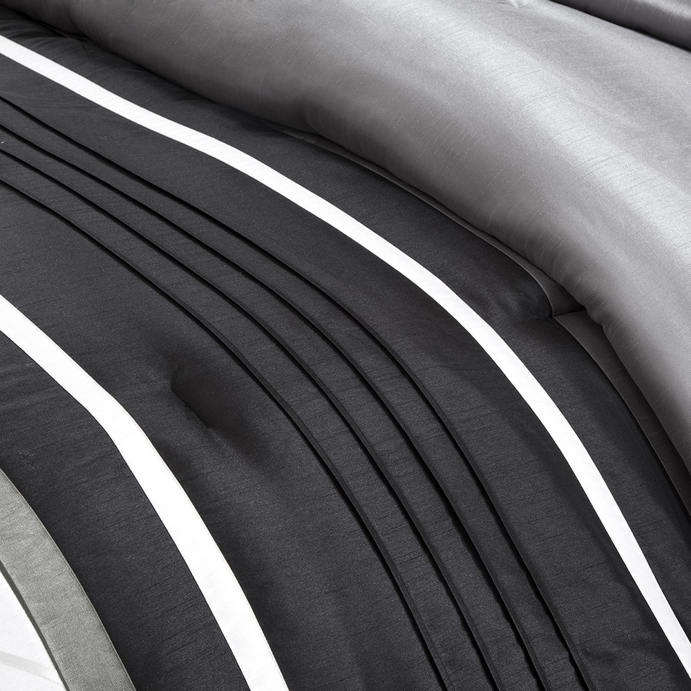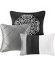 | Madison Park Queen 1 Comforter: 90"W x 90"L 2 Standard Shams: 20"W x 26"L (2) 1 Bed Skirt: 60"W x 80"L + 15"D 1 Decorative Pillow: 16"W x 16"L 1 Decorative Pillow: 18"W x 18"L 1 Decorative Pillow: 12"W x 18"L Comforter & Sham: 100% polyester polyoni pieced on face, 100% microfiber solid reverse, 270g/m2 poly fill Bedskirt: 100% polyester polyoni, 100% polyester platform Pillows: 100% polyester shell, polyester fill Transitional Style Includes 7 Piece(s) MACHINE WASH COLD, GENTLE CYCLE, AND SEPARATELY. DO NOT BLEACH. TUMBLE DRY LOW, REMOVE PROMPTLY. DO NOT IRON. IF THERE IS NO FREE MOVEMENT IN THE WASHER OR DRYER, USE LARGE CAPACITY COMMERCIAL WASHER/DRYER. The Madison Park Blaire 7 Piece Comforter Set offers a rich traditional update to your bedroom decor. The comforter and matching shams feature pieced lustrous silk fabric and pintucking details, in grey, Ivory and black hues, to create a stunning traditional look. Two square decorative pillows and an oblong decorative pillow with embroidered and pintucked details add rich textural touches to the top of the bed. A solid black bedskirt provides the finishing to the luxurious comforter set. Hypoallergenic filling in the comforter and decorative pillows provides exceptional warmth and comfort. Great for year-round use, this pieced faux silk comforter set brings a gorgeous and sophisticated look to your bedroom decor and is machine washable for easy care. |