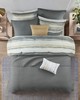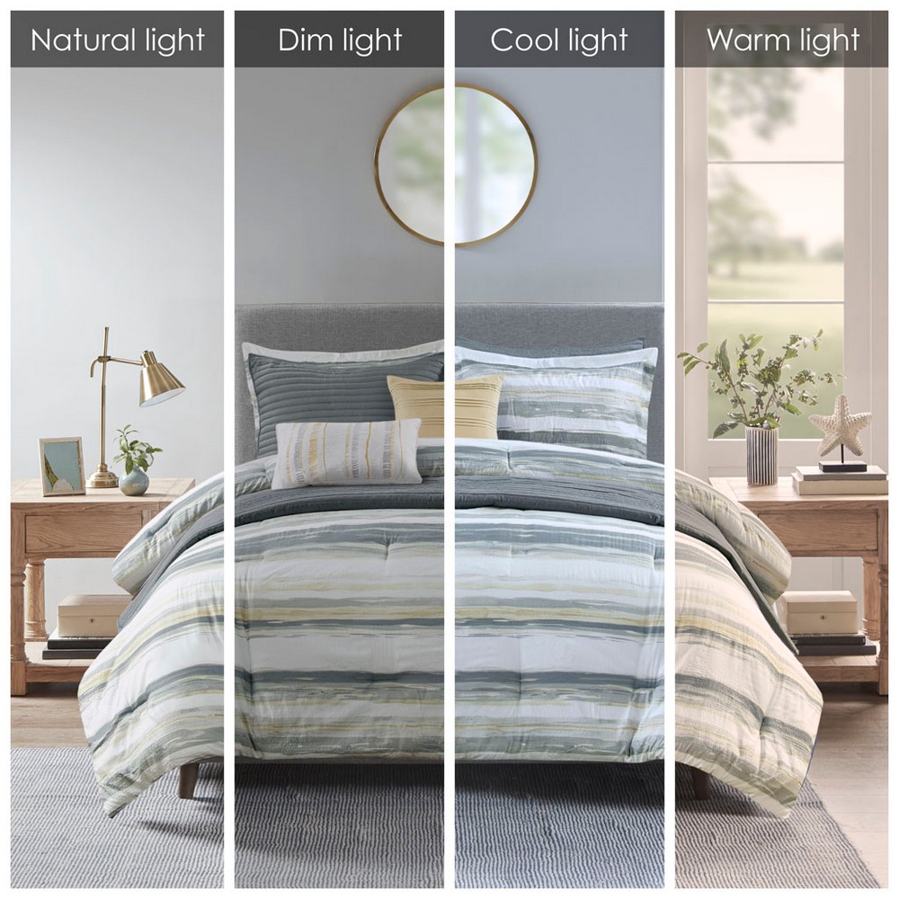 | Madison Park Full/Queen 1 Comforter: 90"W x 90"L 2 Standard Shams: 20"W x 26 "L + 1.5" D (2) 1 Decorative Pillow: 16"W x 16"L 1 Decorative Pillow: 12"W x 18"L 1 Coverlet: 90"W x 90"L 2 Standard Quilted Shams: 20"W x 26"L (2) Comforter and matching shams: Face: 100% polyester soft brushed microfiber, printed seersucker; Reverse: 100% polyester microfiber Comforter Fill: 100% Polyester quilt, matching shams, and pillows: 100% polyester soft brushed microfiber face and back; 100% polyester filling Coastal Style Includes 8 Piece(s) Machine Washable pillow spot clean Create a relaxing and tranquil atmosphere in your bedroom with Madison Park’s Marina 8 Piece Printed Seersucker Comforter and Quilt Set Collection. The textured seersucker comforter features a watercolor stripe print in yellow and gray hues and a off white reverse, for a serene look. The included quilt features channel stitch quilting pattern and its gray color complements the bedding set. Two shams mirror the design on the face of the comforter, while the other two quilted shams pair perfectly with the quilt. Also included are two decorative pillows with embroidered and pleated details that provide the perfect finishing touches to this comforter and quilt set. Use the quilt quilt alone for the summer season or layer it on the comforter for extra warmth. Hypoallergenic polyester filling in the comforter, quilt quilt, and decorative pillows provide exceptional warmth and comfort. Machine washable for easy care, this seersucker comforter and quilt set collection provides a complete transformation for your bedroom decor. |