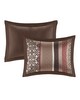 | Madison Park Queen 1 Bedspread: 102"W x 118"L 2 Standard Shams: 20"W x 26"L + 2"Flange (2) 1 Decorative Pillow: 18"W x 18"L 1 Decorative Pillow: 12"W x 18"L Bedspread/Sham: 100% polyester jacquard Fill: 7oz/sq yard 90% cotton, 10% other fiber filling Pillow: 100% polyester faux silk shell, 100% polyester filling Traditional Style Includes 5 Piece(s) Machine washable, spot clean pillows Add a touch of richness to your home décor with the Madison Park Princeton 5 Piece Reversible Jacquard Bedspread Set. Made from polyester jacquard, the bedspread and shams share leaf, striping, and medallion motifs that are accentuated by a solid chocolate brown border and reverse. Pops of red and ivory are also used throughout this bedding collection, adding a lavish feeling to your décor. Two decorative pillows feature pleating and embroidery details that coordinate with the top of the bed to bring the entire look together. |