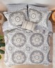 | Madison Park Essentials King 1 Comforter: 104"W x 92"L 2 King Shams: 20"W x 36"L + 2"D (2) 1 Bed Skirt: 78"W x 80"L + 15"D 1 Flat Sheet: 108"W x 102"L 1 Fitted Sheet: 78"W x 80"L + 14"D 2 Pillowcases: 20"W x 40"L (2) 1 Decorative Pillow: 12"W x 18"L Comforter/Sham: 85gsm microfiber, printed, 250g/m2 polyester filling Bedskirt: 85gsm microfiber Sheets: 180TC cotton, printed Pillow: polyester cover and polyester filling Global Inspired Style Includes 9 Piece(s) MACHINE WASH COLD, GENTLE CYCLE, AND SEPARATELY. DO NOT BLEACH. TUMBLE DRY LOW, REMOVE PROMPTLY, DO NOT IRON. IF THERE IS NO FREE MOVEMENT IN THE WASHER OR DRYER, USE LARGE CAPACITY COMMERCIAL WASHER/DRYER. The Madison Park Essentials Serenity Complete Comforter and Cotton Sheet Set provides a fresh globally inspired look for your bedroom. An intricate medallion pattern repeats across the top of bed in brilliant shades of complementary colors to play up the oversized print. An oblong pillow uses decorative embroidery and piecing to create texture on the top of bed. Also included is a complete cotton sheet set that features a coordinating medallion print to complete the look. Bringing the best in health and wellness, this bedding set also features an anti-microbial treatment that provides built-in freshness protection, reducing the growth of odor causing bacteria and keeps fabric lasting longer. This bedding set is also OEKO-TEX certified, meaning it does not contain any harmful substances or chemicals, ensuring quality comfort and wellness. This bedding set may come in rolled or compressed packing and will need to be fluffed up. Use a steam iron to help remove wrinkles easier. |