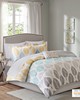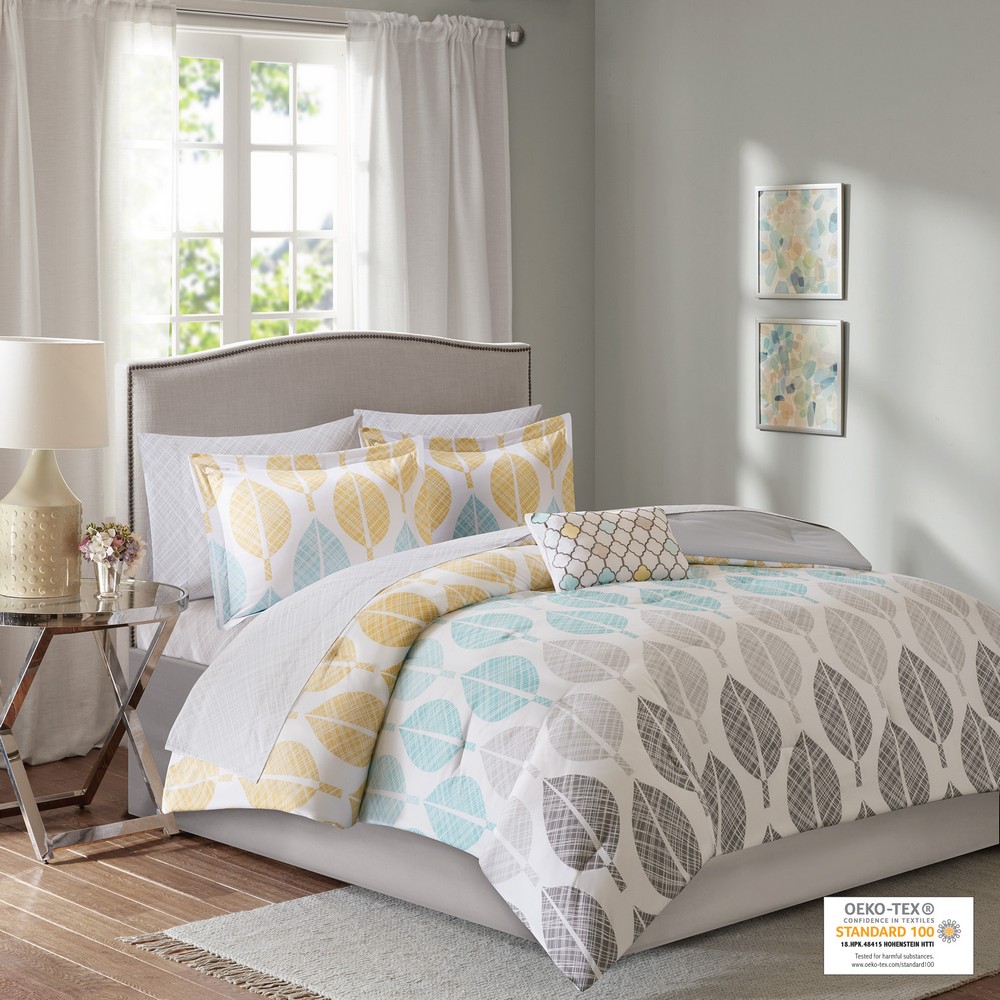 | Madison Park Essentials King 1 Comforter: 104"W x 92"L 2 King Shams: 20"W x 36"L (2) 1 Bedskirt: 78"W x 80"L + 15"D 1 Flat Sheet: 108"W x 102"L 1 Fitted Sheet: 78"W x 80"L + 14"D 2 King Pillowcases: 20"W x 40"L (2) 1 Decorative Pillow: 12"W x 18"L Microfiber printed comforter and shams, 7.3oz/sq yard polyester filling comforter, microfiber skirt and pillow, 180TC 100% cotton printed sheet set; Casual Style Includes 9 Piece(s) Machine washable ,spot clean pillows Create a relaxing vibe in your bedroom with the Madison Park Essentials Central Park Comforter Set with Cotton Sheet Set. This bedding set is OEKO-TEX certified, meaning it does not contain any harmful substances or chemicals, ensuring quality comfort and wellness. The comforter features a printed yellow and aqua leaf design in soft and pleasant colors against a white backdrop, for a charming botanical look. A solid grey reverse coordinates perfectly with the bed skirt and matching shams (1 for Twin Sizes) bring the floral motif to the head of the bed. Also included is a complete sheet set that harmonizes beautifully with the rest of the ensemble. An embroidered decorative pillow adds the finishing touch to the look. Bringing the best in health and wellness, this bedding set also features an anti-microbial treatment that provides built-in freshness protection, reducing the growth of odor causing bacteria and keeps fabric lasting longer. This bedding set may come in rolled or compressed packing and will need to be fluffed up. Use a steam iron to help remove wrinkles easier. |