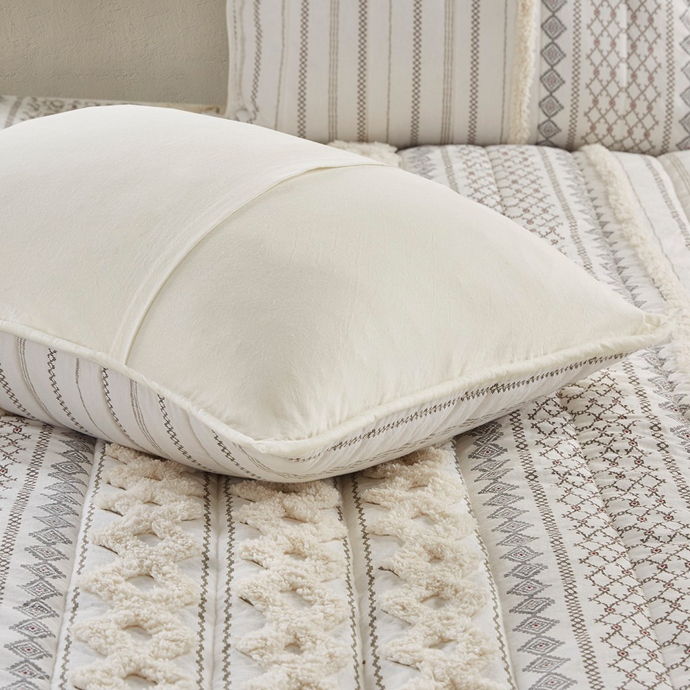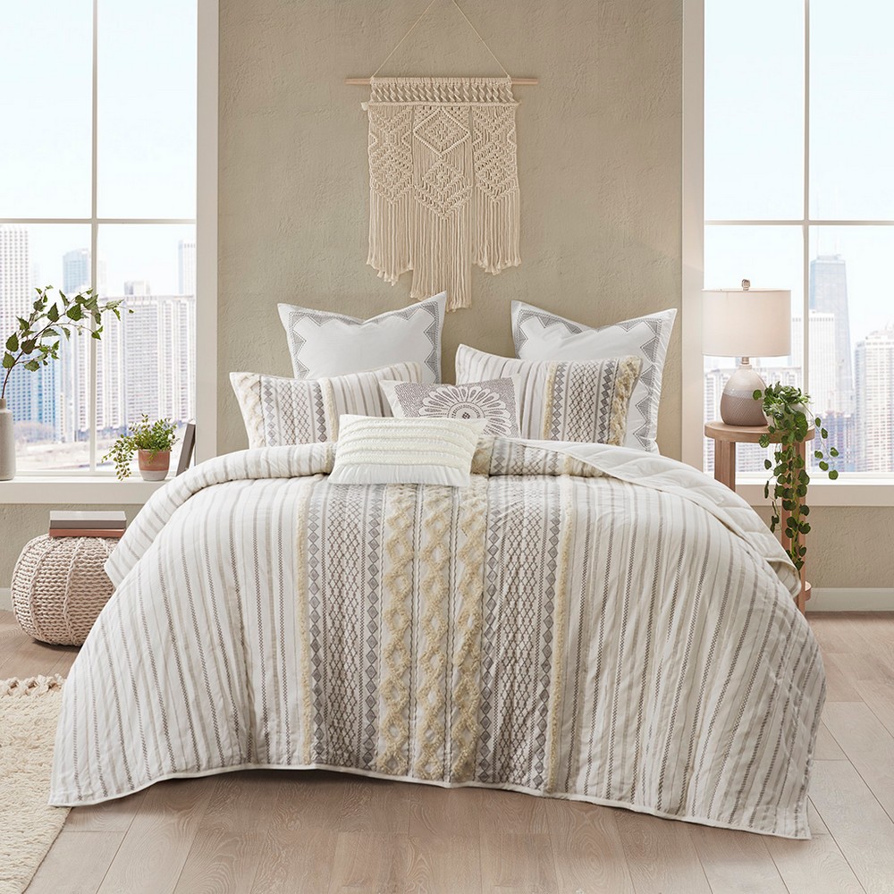 | Ink+ivy Full/Queen 1 Coverlet: 88"W x 92"L 2 Standard Shams: 20"W x 26"L + 0.5"D (2) Coverlet/Sham: 100% cotton, printed and tufted with chenille, all over hand quilted, coverlet with poly fill. Sham with 0.5" piping all around. Sham with overlap openning at back Style Includes 3 Piece(s) Machine wash cold separately, gentle cycle. Tumble dry low. Do not bleach. Do not iron. Commercial washer and dryer recommended to provide ample room for movement Bring a soft, mid-century look to your bedroom with the INK+IVY Imani Cotton Coverlet Mini Set. The ivory cotton coverlet features geometric prints with tufted chenille that adds dimension and charm to the bedding set. Hidden bartacks give the coverlet a duvet-like finish, while the solid ivory reverse complements the eye-catching patterns seen on top of the bed. Two cotton shams reiterate the designs of the coverlet, creating a stunning coordinated look. This coverlet is also OEKO-TEX certified, meaning it does not contain any harmful substances or chemicals, ensuring quality comfort and wellness. Made from 100% cotton, this coverlet mini set is machine washable and offers a refreshingly soft update to your bedroom décor. |