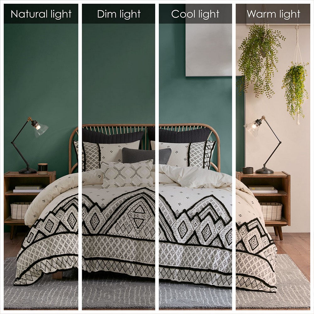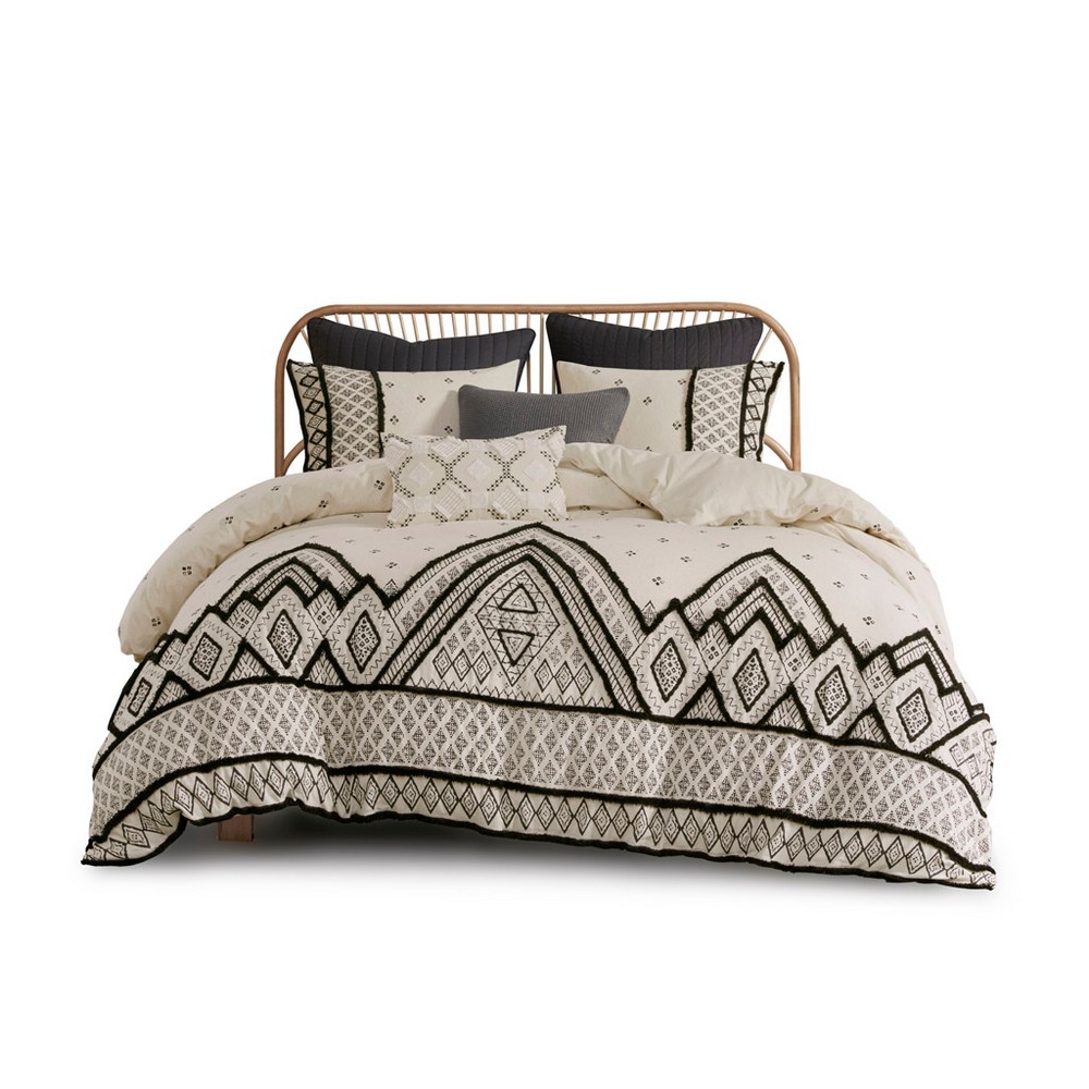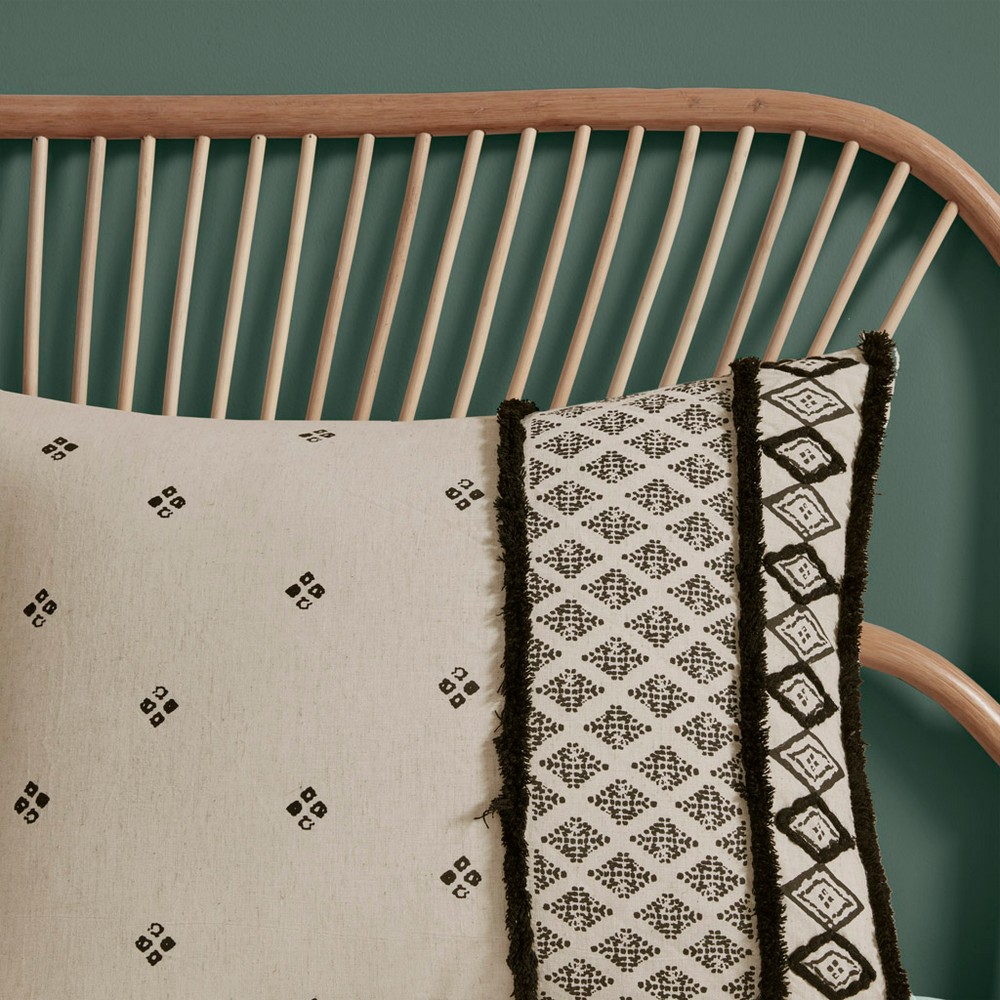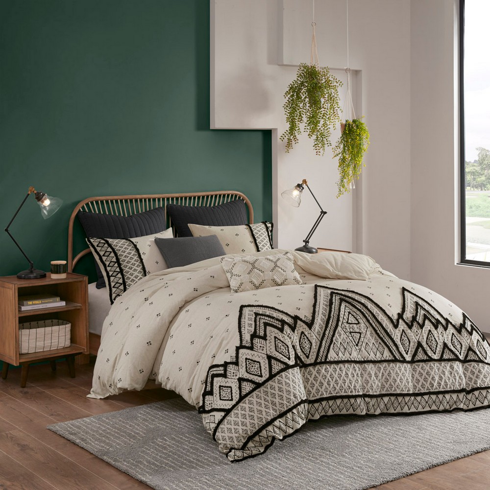 | Ink+ivy Full/Queen 1 Duvet Cover: 88"W x 92"L + 2"D 2 Standard Shams: 20"W x 26"L (2) Duvet Cover/Sham face: 85% cotton, 15% flax linen, printed with chenille look taping and trim embellishment; Duvet Cover/Sham reverse: 100% cotton Global Inspired Style Includes 3 Piece(s) Machine wash cold separately, gentle cycle. Tumble dry low. Do not bleach. Do not iron. Commercial washer and dryer recommended to provide ample room for movement Create a modern-boho eclectic look in your bedroom with the INK+IVY Marta 3 Piece Cotton Duvet Cover Set. The natural-hued cotton and flax linen duvet cover and shams features a black diamond print with black chenille textured trim that adds dimension and creates a globally inspired look. The cotton flax linen fabric creates a crisp, natural texture. A button closure allows you to place a comforter insert within the duvet cover and inside corner ties prevent it from shifting (insert is NOT included). Machine washable for easy care, this cotton duvet cover set combines style and comfort to elevate your bedroom. |