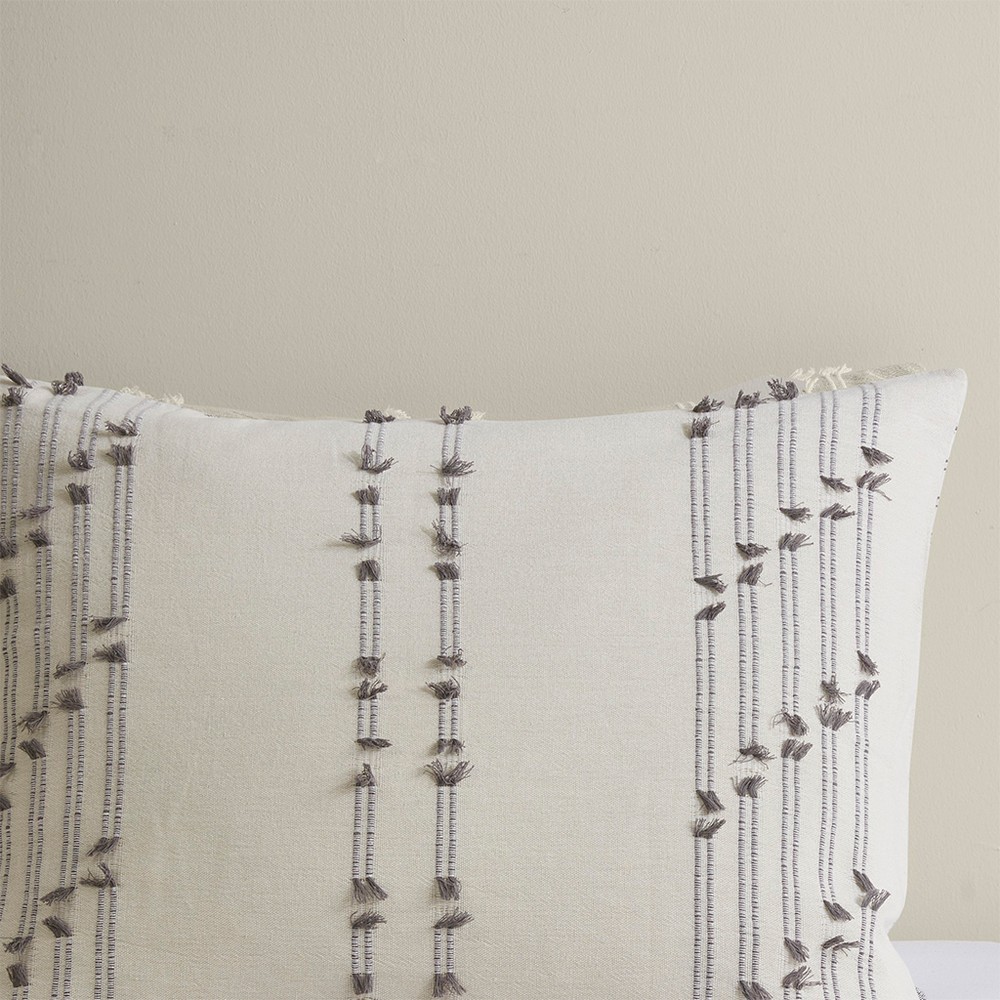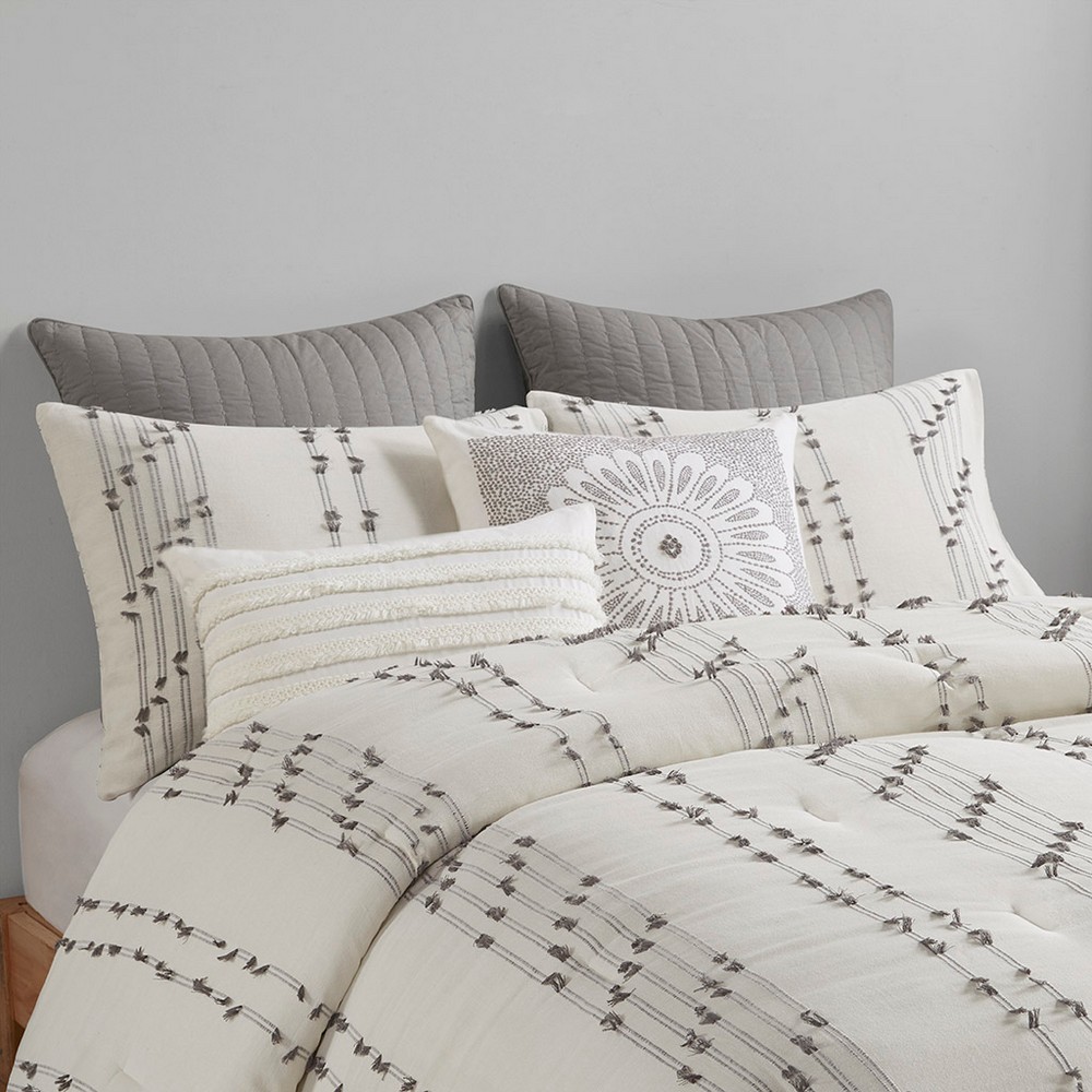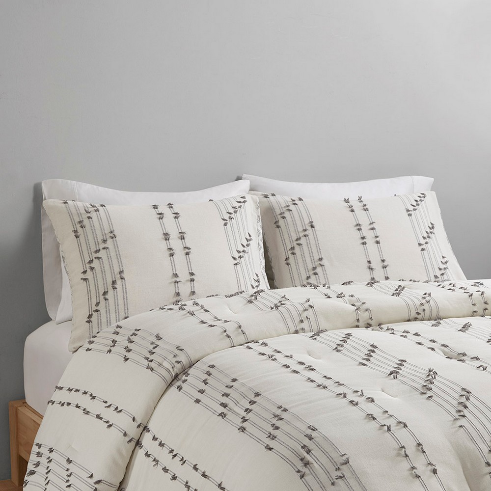 | Ink+ivy Full/Queen 1 Comforter: 88"W x 92"L 2 Standard Shams: 20"W x 26"L (2) Comforter/Sham: 100% cotton clipped jacquard, solid cotton reverse, comforter filling: 250gsm polyester, front hidden bar tack. Sham with overlap closure at back. Style Includes 3 Piece(s) Machine washable. Use large capacity washer and dryer to agitate and tumble for best results. Cold or delicate cycle. Dry on low or no heat. The INK+IVY Kara Cotton Jacquard Comforter Mini Set offers an eye-catching update to your bedroom decor. This comforter features a 100% cotton jacquard striped design on the face with a Light Grey diamond print on the Ivory reverse. The comforter also has a clean, duvet-like finish with hidden bar tacking on top of the bed. Two matching shams coordinate with the comforter to complete a globally-inspired design. Machine washable for easy care, this unique comforter set brings style and comfort to your bedroom. This bedding set is also OEKO-TEX certified, meaning it does not contain any harmful substances or chemicals, ensuring quality comfort and wellness. |