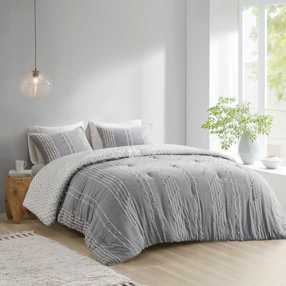 Kara 3 Piece Cotton Jacquard Comforter Set Gray Full Queen