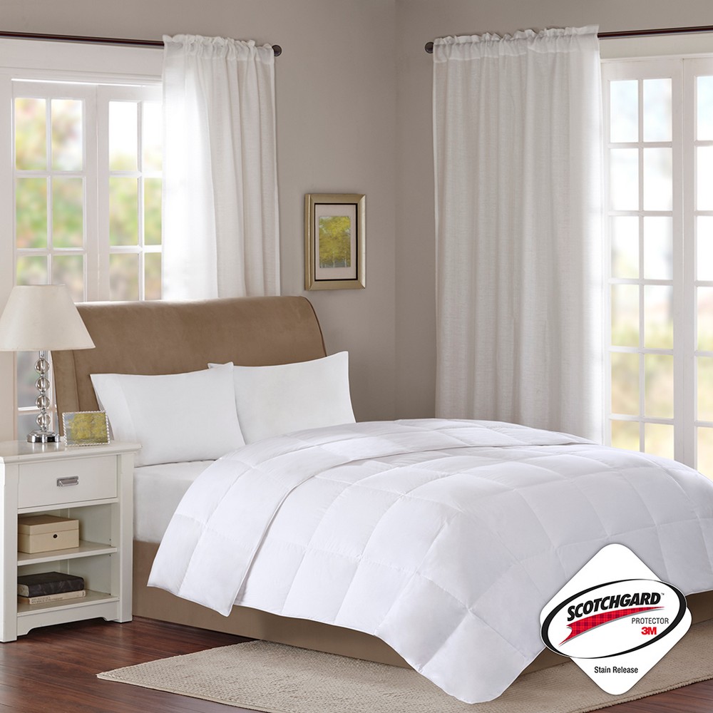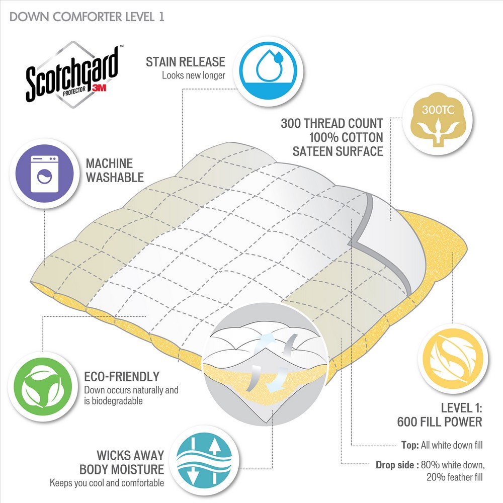 | True North By Sleep Philosophy Twin 1 Comforter: 68x88" . Comforter cover - 300TC cotton sateen . Filling - 80% white duck down, 20% feather . Filling ounce weights: Twin-18 oz, Full/Queen-25 oz, King-29 oz Casual Style Includes 1 Piece(s) Machine wash warm gentle cycle. Only non-chlorine bleach when needed. Tumble dry low heat until thoroughly dry. Do not iron. The True North Stain Release 3M Scotchgard 300 Thread Count Cotton Sateen White Down Comforter in level 1 is perfect for all-season use. The comforter is filled with high-quality 600 fill power 80% white down, 20% feather. Did you know that down provides approximately three times the warmth per ounce compared to even the best synthetic alternatives? Down is also breathable and helps to wick away moisture while you sleep. Our 300 thread count, 100% cotton sateen cover features 3M Scotchgard stain release which removes dirt easier in wash. The fabric remains soft and breathable while helping to keep your comforter looking newer longer. The end-to-end sewn-through box quilting ensures that the white down doesn't shift, so you'll never have any cold spots on the bed. Four corner loops on the comforter can be tied to help secure it within a duvet cover. This comforter is also OEKO-TEX certified, meaning it does not contain any harmful substances or chemicals, ensuring quality comfort and wellness. Items in the set may come in a rolled or compressed packaging, which will need to be fluffed up or steam ironed before use to remove wrinkles. |