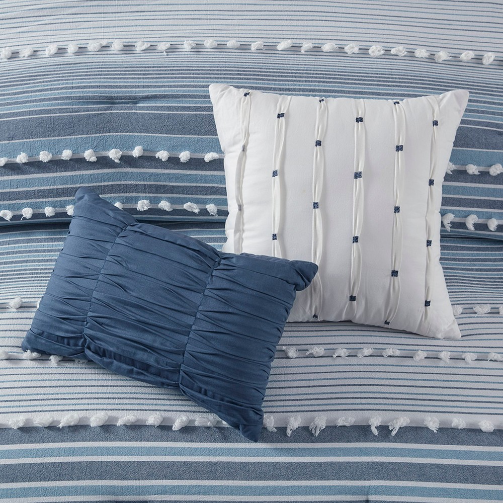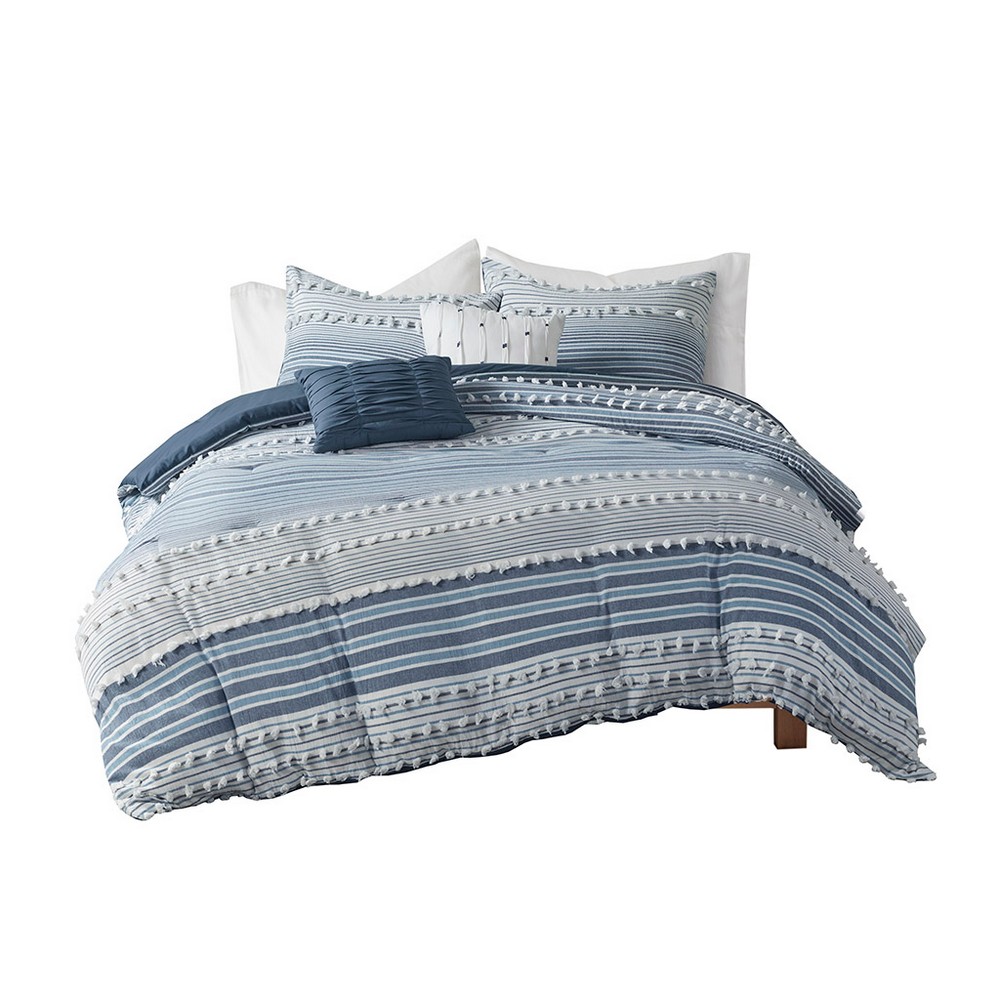 | Urban Habitat Full/Queen 1 Comforter: 88"W x 92"L 2 Standard Shams: 20"W x 26"L (2) 1 Decorative Pillow: 12"W x 18"L 1 Decorative Pillow: 18"W x 18"L Comforter/Sham: 100% cotton clipped yarn dye fabric on face, cotton solid reverse; comforter with poly fill. Sham with overlap closure at back. Pillow: 100% cotton cover, poly fill. Modern/Contemporary Style Includes 5 Piece(s) Machine Washable, Spot Clean Pillows Give your bedroom a soft casual update with the Urban Habitat Calum Cotton Jacquard Comforter Set. The cotton clipped jacquard comforter features yarn-dyed stripes of blue, indigo, and off-white, for a soft and alluring look. Matching shams (1 for Twin Sizes) mirror the design seen on top of the bed, while two decorative pillows add the finishing touches to the bed. Hypoallergenic polyester filling in the comforter and pillows provides exceptional warmth and comfort. This bedding set is also OEKO-TEX certified, meaning it does not contain any harmful substances or chemicals to ensure quality comfort and wellness. Easy to coordinate with, this cotton jacquard comforter set brings a rich textural look and feel to your bedroom decor and is machine washable for easy care. |