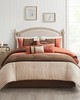 The Madison Park 7 Piece Palisades Comforter Set offers you a casual alternative in fashion bedding. The reverse of the comforter is solid coral. The soft microsuede in ivory, coral and brown is pieced together to create this beautiful bed. The decorative pillows are embroidered and pieced to add a decorative element to this simple, yet beautiful bedding collection. With hypoallergenic filling in the comforter and pillows, this stylish comforter set easily refreshes your bedroom décor and is machine washable for easy care. Items in the set may come in a rolled or compressed packaging, which will need to be fluffed up or steam ironed before use to remove wrinkles.