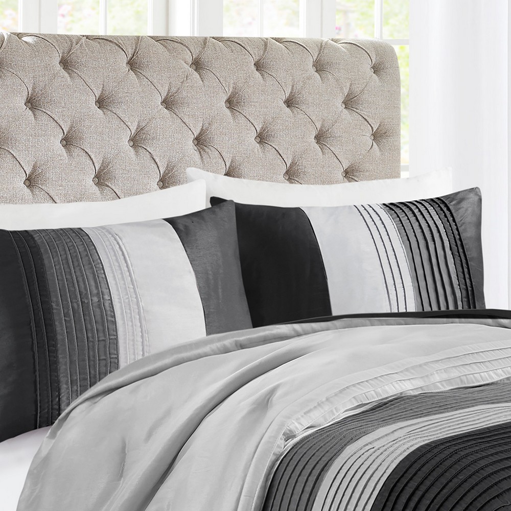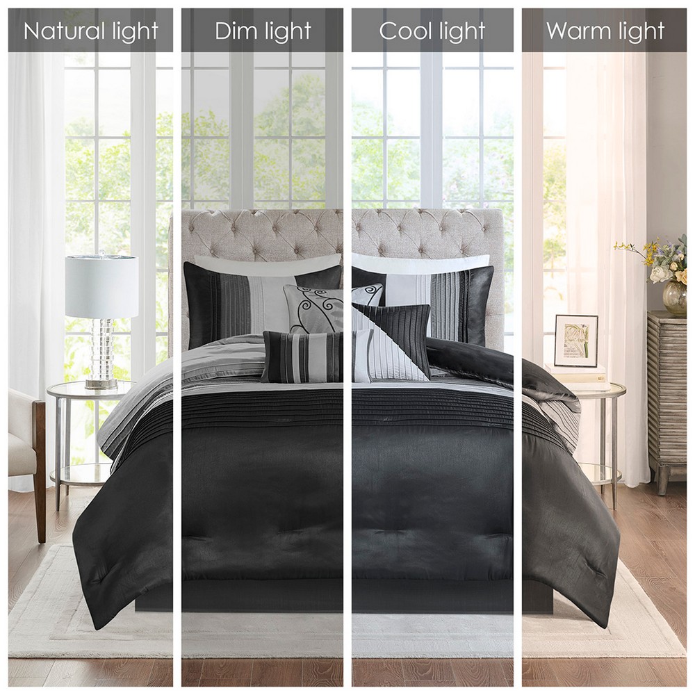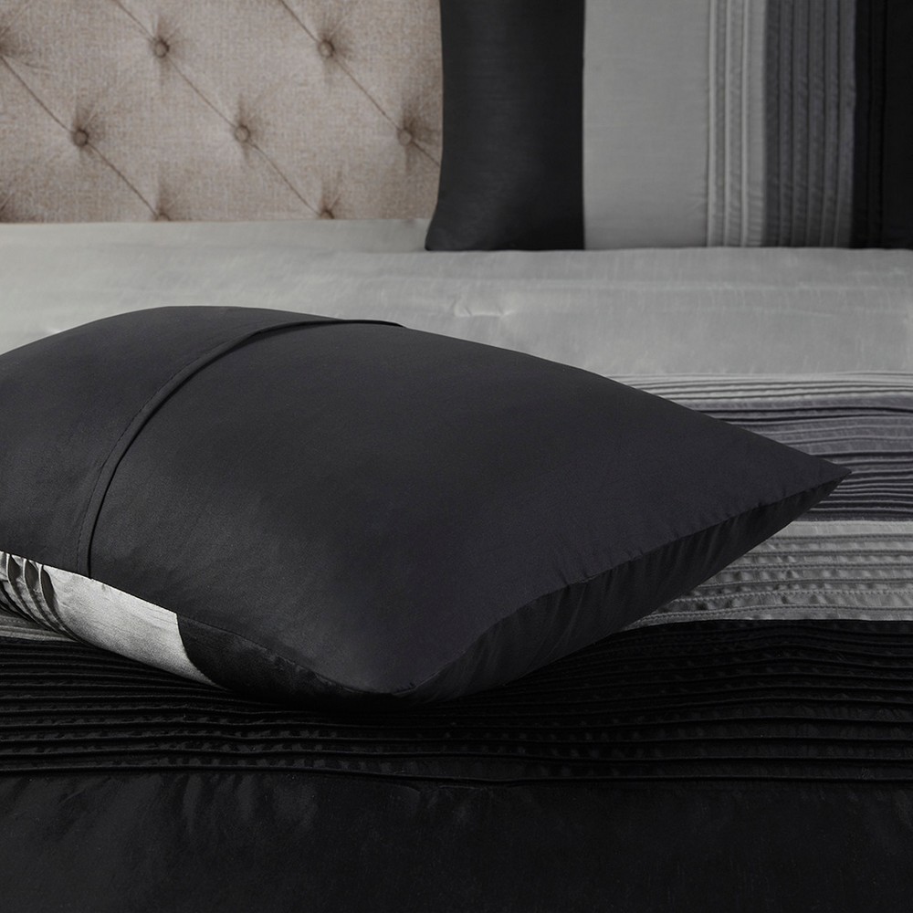 | Madison Park Cal King 1 Comforter: 104"W x 92"L 2 King Shams: 20"W x 36"L (2) 1 Bedskirt: 72"W x 84"L + 15"D 1 Decorative Pillow: 16"W x 16"L 1 Decorative Pillow: 12"W x 20"L 1 Decorative Pillow: 18"W x 18"L Comforter/Sham: 100% polyester polyoni, pieced with pleats, 100% brushed polyester reverse, 270g/m2 polyester filling Bedskirt: 100% polyester fabric drop, polyester platform Pillow: 100% polyester polyoni cover with polyester fill Transitional Style Includes 7 Piece(s) Machine wash gentle, do not bleach. Dry on low, warm iron if necessary The Amherst bed set is where casual meets contemporary. The clean color lines of this set make it simple in a way that you can accessorize any way you want. Sleek piping of the fabric on the comforter and pillows gives a strong visual dimension and ties the whole bed together. In addition, there is a floral pillow that adds a softness which is different from the manipulation of fabric and colors on the rest of the set. |