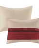 | Madison Park King 1 Comforter: 104"W x 92"L 2 King Shams: 20"W x 36"L (2) 1 Bedskirt: 78"W x 80"L + 15"D 1 Decorative Pillow: 18"W x 18"L 1 Decorative Pillow: 16"W x 16"L 1 Decorative Pillow: 12"W x 20“L Comforter/Sham: 100% polyester microsuede, pieced, 100% brushed polyester reverse, 270g/m2 polyester filling; Bedskirt: 100% polyester microsuede drop, 100% polyester platform; Pillow: 100% polyester shell, polyester filling. Transitional Style Includes 7 Piece(s) MACHINE WASH COLD, GENTLE CYCLE, AND SEPARATELY. DO NOT BLEACH. TUMBLE DRY LOW, REMOVE PROMPTLY, DO NOT IRON. IF THERE IS NO FREE MOVEMENT IN THE WASHER OR DRYER, USE LARGE CAPACITY COMMERCIAL WASHER/DRYER. The Madison Park Palmer 7 Piece Comforter Set offers a classic and refined update to your bedroom decor. This transitional style comforter features a pieced microsuede design in rich contrasting red and khaki colors to create an incredibly soft look and feel. The 2 matching shams also flaunt a pieced construction to coordinate with the faux suede comforter. A solid brown bed skirt and 3 decorative pillows with a mix of embroidered designs add the perfect finishing touches to complete this lush traditionally-inspired comforter. Machine washable for easy care, items in the set may come in a rolled or compressed packaging, which will need to be fluffed up or steam ironed before use to remove wrinkles. |
