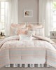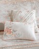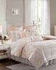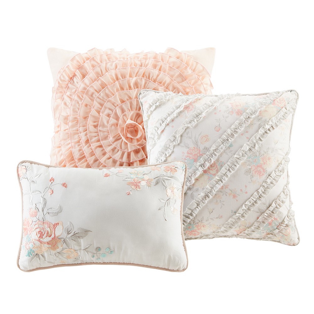 | Madison Park Twin/Twin XL 1 Comforter: 68"W x 90"L 1 Standard Sham: 20"W x 26"L 1 Bedskirt: 39"W x 75"L + 15"D 1 Euro Sham: 26"W x 26"L 1 Decorative Pillow: 12"W x 18"L 1 Decorative Pillow: 16"W x 16"L 1 Decorative Pillow: 18"W x 18"L Comforter/Sham: 180TC cotton percale, printed, piecing, tufted , 180TC cotton/polyester reverse, 270g/m2 polyester filling Bedskirt: 180TC cotton/polyester drop, polyester fabric platform Euro Sham: 180TC cotton/poly Pillow: 180TC cotton/poly cover, polyester filling Cottage/Country Style Includes 7 Piece(s) MACHINE WASH COLD, GENTLE CYCLE, AND SEPARATELY. DO NOT BLEACH. TUMBLE DRY LOW, REMOVE PROMPTLY, DO NOT IRON. IF THERE IS NO FREE MOVEMENT IN THE WASHER OR DRYER, USE LARGE CAPACITY COMMERCIAL WASHER/DRYER. Madison Park Serendipity brings a touch of charm and grace to your cozy retreat. This lovely set features a 180 thread count cotton fabric with a delicate floral print in peach and grey, contrasted by grey and white polka dots, and reverses to a solid light peach. Each pattern is separated by a ruffle detail that adds a feminine flair. The edges are also adorned with a ruffle detail for extra elegance. The set is complemented by three decorative pillows and two Euro shams (1 Euro sham for Twin sizes) that showcase embroidery and fabric manipulation skills to add texture and depth to the bed. |