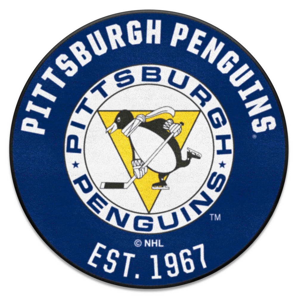 | Retro NHL Pittsburgh Penguins Roundel Rug - 27in. Diameter 9 Ounce, 100 % Nylon Face Recycled vinyl backing for a durable and longer-lasting product Machine made and tufted in the USA Non-skid backing with taped borders for added durability Machine washable; vacuum regularly and spot clean for any easy and quick clean Officially licensed and chromojet-printed in true team colors for vibrant, lasting color NHLV - Pittsburgh Penguins in Pennsylvania NHL National Hockey League |