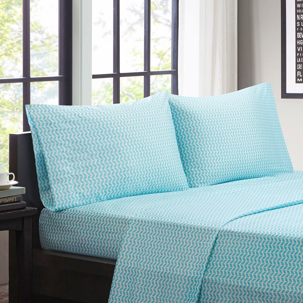 | Intelligent Design Twin 1 Fitted Sheet: 39x75+12" 1 Pillowcase: 21x30" 1 Flat Sheet: 66x96" 100% polyester Casual Style Includes 1 Piece(s) MACHINE WASH COLD, GENTLE CYCLE, AND SEPARATELY. DO NOT BLEACH. TUMBLE DRY LOW, REMOVE PROMPTLY. DO NOT IRON. IF THERE IS NO FREE MOVEMENT IN THE WASHER OR DRYER, USE LARGE CAPACITY COMMERCIAL WASHER/DRYER. The Intelligent Design Chevron Printed Microfiber Sheet Set adds a bright and colorful style to your bedroom. This microfiber sheet set is naturally wrinkle-free and flaunts a vivid chevron print creating a fun and cheerful look. These microfiber sheets have an antimicrobial treatment for health and wellness - kills and prevents bacteria buildup, helps reduce odors, and enhances hygiene. These sheets are also OEKO-TEX certified, meaning they do not contain any harmful substances or chemicals, ensuring quality comfort and wellness. Set includes: 1 Flat Sheet, 1 Fitted Sheet, and 2 Pillowcases (1 in Twin/TwinXL). The fitted sheet fits up to a 14-inch mattress. |