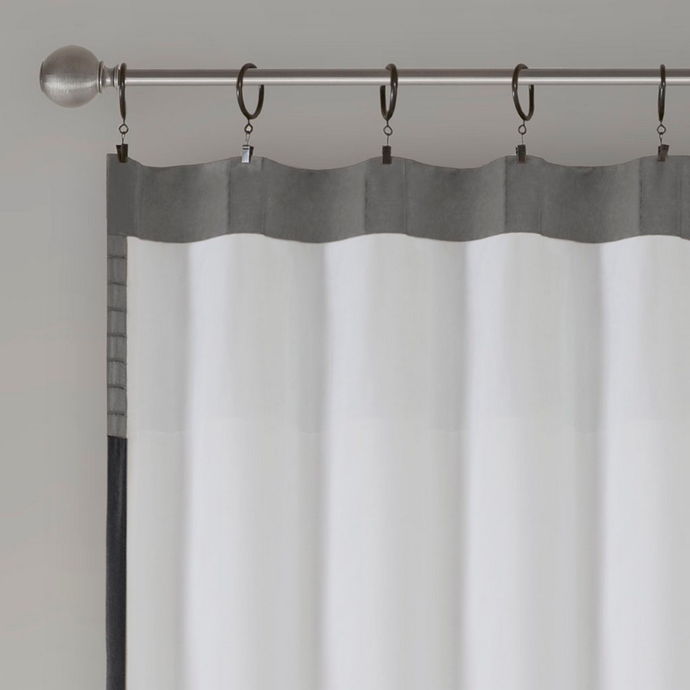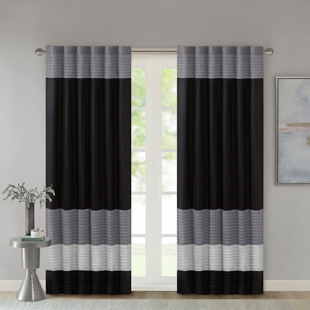 | Madison Park 50x84" 1 Window Curtain: 50x84" 100% Polyester Polyoni.Lining: 100% Polyester Transitional Modern Style Includes 1 Piece(s) Machine wash cold, gentle cycle, and separately. Do not bleach. Tumble dry low, remove promptly. Do not iron. If there is no free movement in the washer or dryer, use large capacity commercial washer/dryer. Madison Park Amherst Polyoni Pintuck Window Curtain is a simple way to add style to your room. This window panel features a modern striped design in dark hues of black, charcoal, and silver combined with pintuck detailing for beautiful texture and dimension. The added lining helps filter the perfect amount of light and creates fullness for better drapability. Simply hang using rod pocket or with back tabs for a tailored look. This window curtain fits up to a 1.25" diameter rod. |