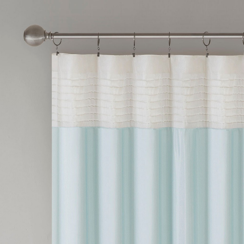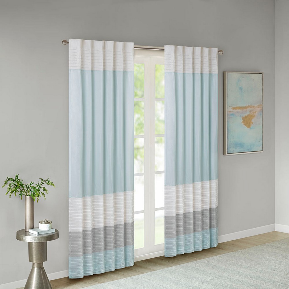 Amherst's modern color block design is a simple way to add style to your room. This window panel features color block stripes in soft hues of aqua, grey, and ivory combined with pintuck detailing for beautiful texture and dimension. Added lining helps to filter the perfect amount of light and creates a fuller look. Hang using the rod pocket or back tabs for a tailored look. Fits up to 1.25" diameter rod.