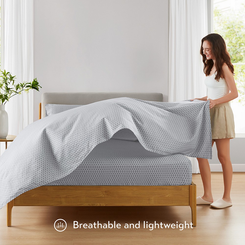 | 510 Design Twin XL 1 Flat Sheet: 66"W x 96"L 1 Fitted Sheet: 39"W x 80"L + 12"D 1 Pillowcase: 20"W x 30"L 100% Cotton Casual Style Includes 3 Piece(s) Machine Washable Experience comfort with our 144 Thread Count Cotton Sheets set. These sheets are designed to be breathable and soft. The fitted sheet includes a 14" elastic deep pocket for a secure fit. Ideal for both warm summer nights and chilly winter evenings, these lightweight 100% cotton sheets offer perfect all-season versatility. The eye-catching printed diamond pattern adds a stylish touch to any bedroom year-round. These sheets are durable and machine washable, ensuring they stay soft and fresh over time. Additionally, this set hilds an Oeko-Tex certified, meaning they’re safe and gentle on your skin. The set includes 1 Flat Sheet, 1 Fitted Sheet, and 1 Pillowcase for a complete bedding solution. |