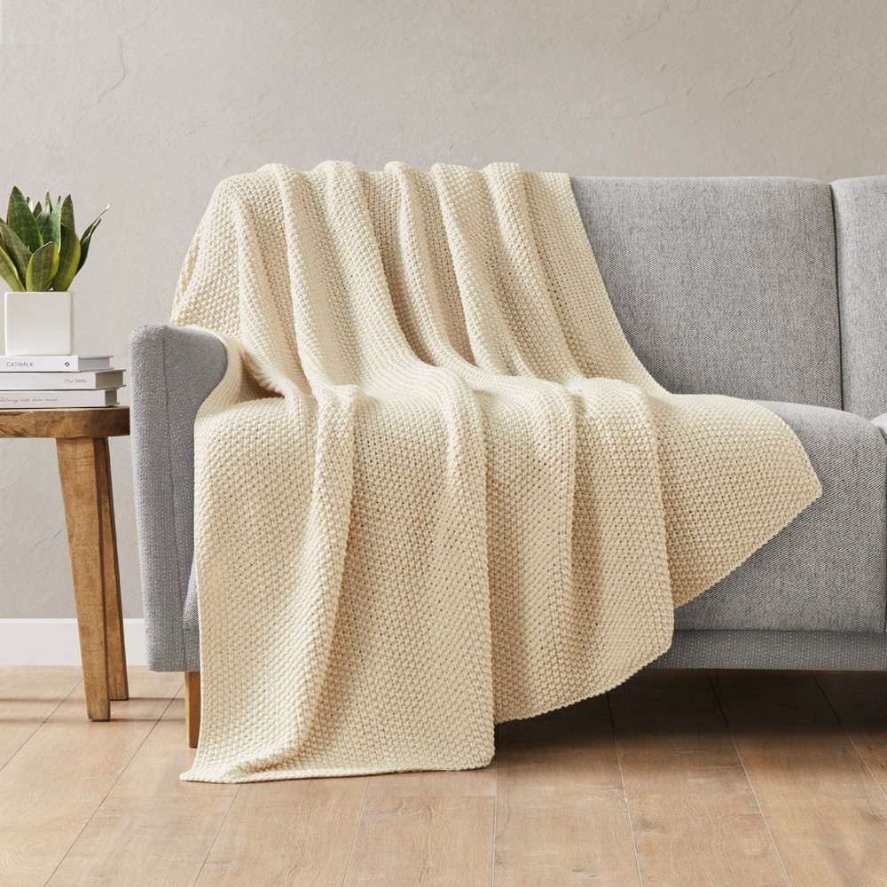 | Ink+ivy 50x60" 1 Throw: 50"W x 60"L 100% acrylic Casual Style Includes 1 Piece(s) MACHINE WASH COLD, GENTLE CYCLE, AND SEPARATELY. DO NOT BLEACH. TUMBLE DRY LOW, REMOVE PROMPTLY, DO NOT IRON. IF THERE IS NO FREE MOVEMENT IN THE WASHER OR DRYER, USE LARGE CAPACITY COMMERCIAL WASHER/DRYER. Bundle up in the warm and cozy comfort of the INK+IVY Bree Knit Throw. This ultra-soft, 100% acrylic throw features a classic knit design that creates a charming cottage look, while providing a rich feel perfect for draping over your sofa. Machine washable for easy care, this knit throw blanket brings a cozy country vibe to your space. |