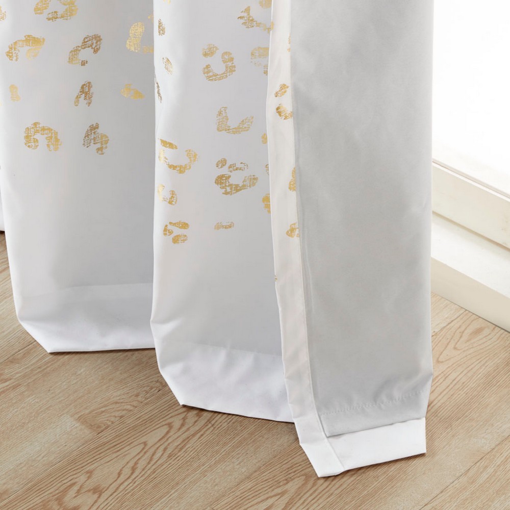 Add a touch of glam to your room with the Intelligent Design Lillie Grommet Top Metallic Animal Printed Total Blackout Curtain. A gold metallic animal print shines on the ultra-soft brushed white microfiber fabric to create a fun and glam modern look; while the 2 Pass foamback total blackout liner provides a thermal energy efficient barrier that helps block any exterior light and noise intrusion, for the highest level of privacy. This total blackout window panel is finished with an antimicrobial treatment providing built in freshness protection, inhibiting growth of odor causing bacteria, and keeping linen newer, longer. While also achieving the OEKO-TEX certification, meaning it does not contain any harmful substances or chemicals, ensuring quality comfort and wellness. Silver grommet top finish makes this curtain easy to hang, open, and close panels throughout the day; while fitting up to a standard 1.25” diameter rod. As shown in the image, 2 curtain panels need to be purchased to provide coverage for any standard size window. Coordinating bedding is also available and sold separately.