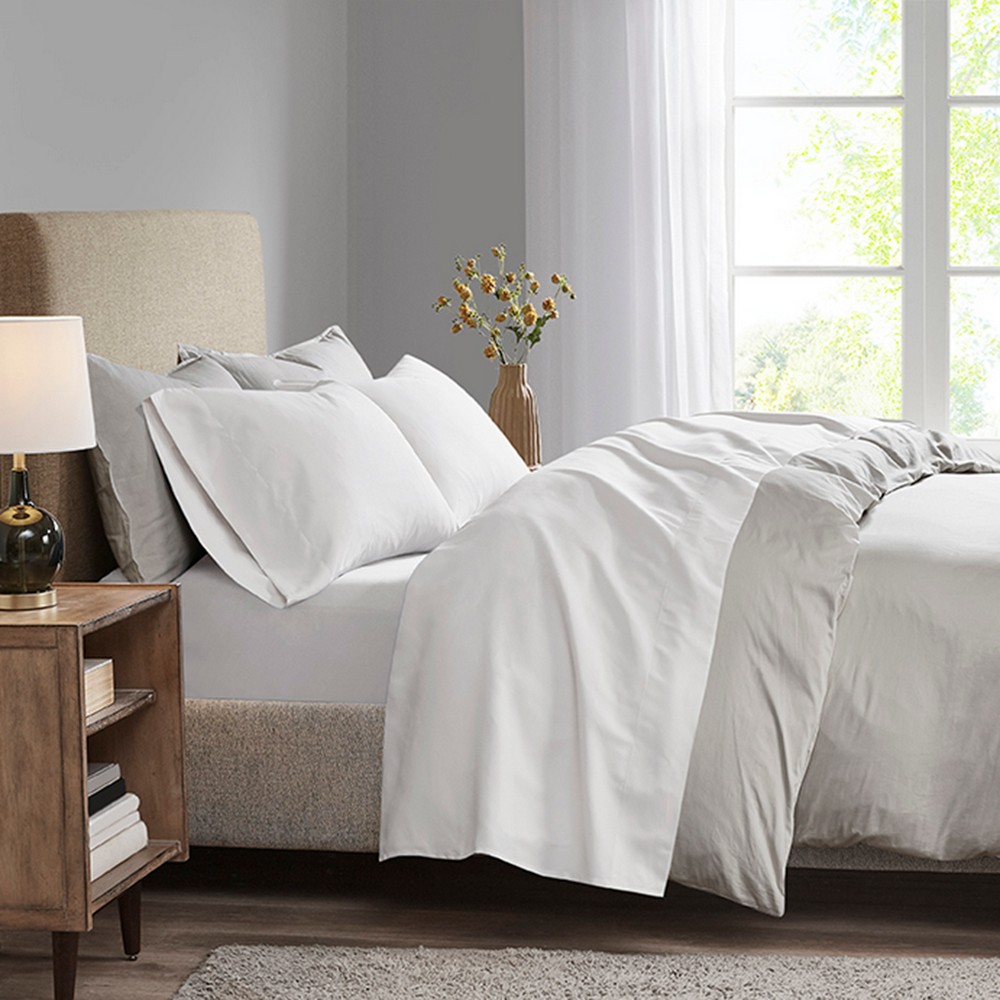 | Madison Park Queen 1 Flat Sheet: 90x102" 1 Fitted Sheet: 60x80+16" 2 Pillowcases: 20x30" (2) 100% polyester, 120gsm, w/ 3M Moisture Management Treatment Casual Style Includes 1 Piece(s) MACHINE WASH COLD, GENTLE CYCLE, AND SEPARATELY. DO NOT BLEACH. TUMBLE DRY LOW, REMOVE PROMPTLY. DO NOT IRON. IF THERE IS NO FREE MOVEMENT IN THE WASHER OR DRYER, USE LARGE CAPACITY COMMERCIAL WASHER/DRYER. Wrap yourself in a cool and comfortable sleep with this moisture wicking luxurious brushed microfiber sheet set. This soft and lightweight sheet set features 3M Scotchgard moisture treatment that wicks away moisture to keep you cool. Fade and stain resistant, this deep pocket sheet set lasts wash after wash and is easy to clean. Our sheets go through a very light brushing process that gives them an incredible soft feel against your skin. These sheets are also OEKO-TEX certified, meaning they do not contain any harmful substances or chemicals, ensuring quality comfort and wellness. |