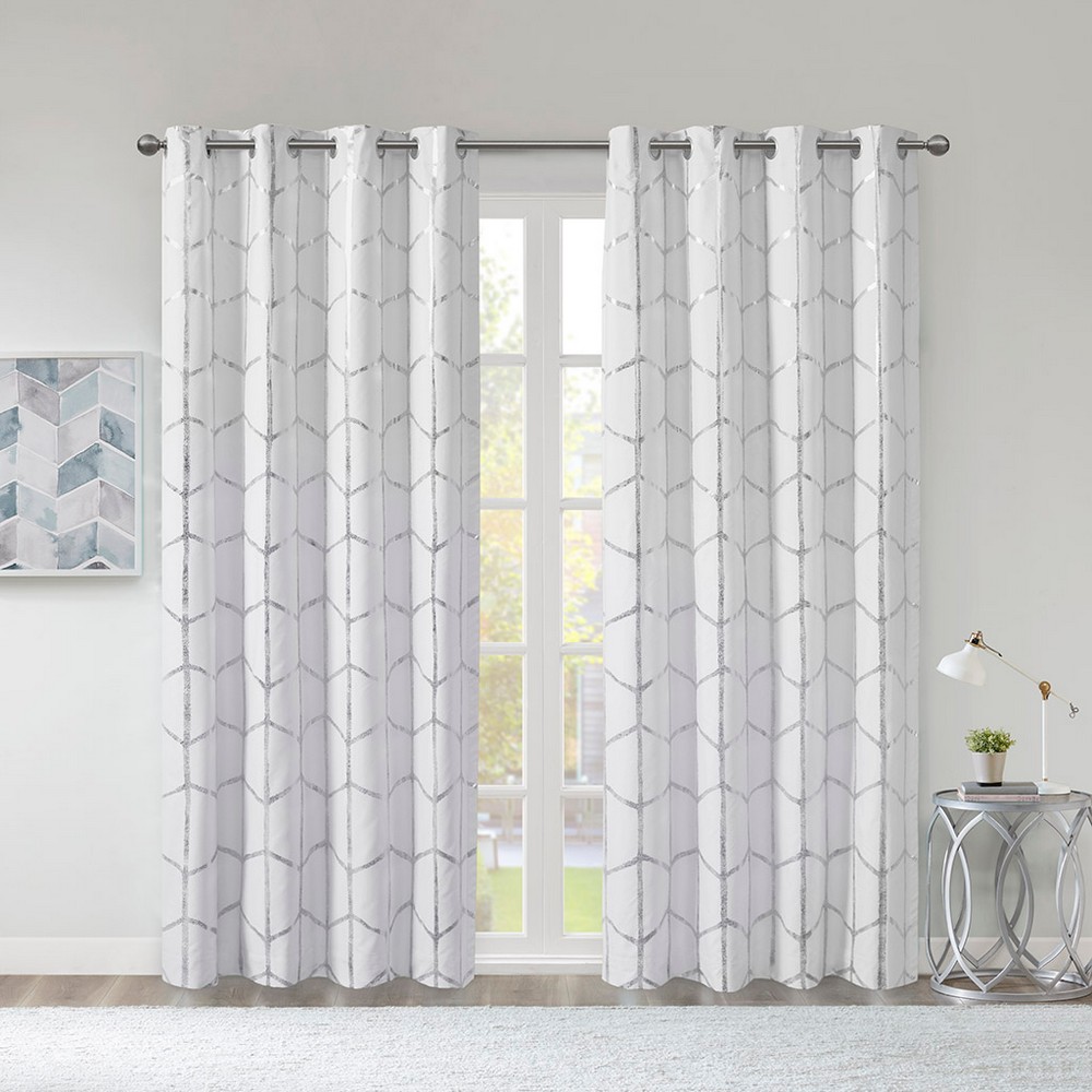 Raina White/Silver Total Blackout Metallic Print Grommet Top Curtain Panel