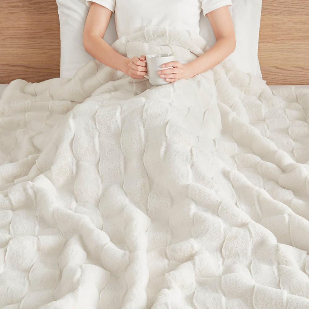 | Madison Park 50x60" 1 Throw: 50"W x 60"L Face: 100% polyester solid basketweave fur Reverse: 100% polyester crystal velvet Glam/Luxury Style Includes 1 Piece(s) • Machine wash cold, separately on gentle cycle. Do not bleach • Tumble dry low, remove promptly. • If there is no free movement in the washer or dryer, use large capacity machine This faux fur throw combines the best of luxury and warmth for your living room. The fur face features a textured basket weave pattern, while the neutral color options create a beautiful and stylish aesthetic to complement any decor. This throw is machine washable for convenient cleaning, and Oeko-Tex certified to ensure quality comfort and wellness. |