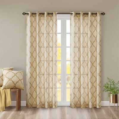 | Madison Park 50x108" 1 Window Curtain: 50x108" 68% poly 29% cotton 3% rayon; basket weave print, Grommet Top Modern/Contemporary Style Includes 1 Piece(s) Delicate machine wash cold, gently and seperately, use non-chlorine bleach when needed, hang dry, do not iron, light garment/fabric steamer safe The Madison Park Saratoga Fret Print Panel is the perfect addition for a casual and stylish update to your home decor. This window panel features a trendy metallic gold fretwork on a soft beige ground, creating a simple yet modern look. The cotton blend basket weave fabric softly filters the perfect amount of sunlight into your home, while providing texture for natural appeal. Gunmetal grommet top detail makes this panel easy to hang, open, and close throughout the day. Fits up to a 1.25" diameter rod. Pattern position may vary per panel due to random cutting of fabric. |