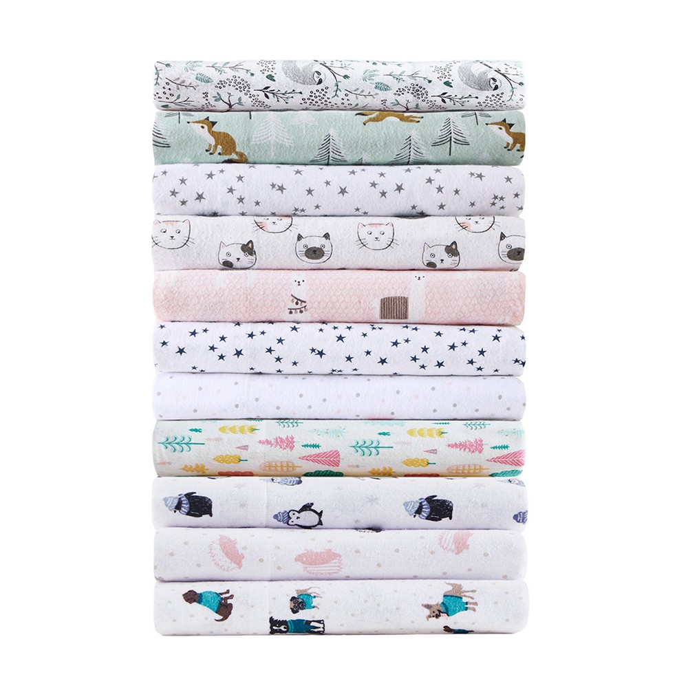 | Intelligent Design Queen 1 Flat Sheet: 90”W x 102“L 1 Fitted Sheet: 60”W x 80“L + 14"D 2 Standard Pillowcases: 20"W x 30"L (2) 100% Cotton printed flannel Casual Style Includes 4 Piece(s) Machine Washable This warm cotton flannel sheet set features a fun novelty print to create a cute look with a comfortable feel. These sheets are also OEKO-TEX certified, meaning they do not contain any harmful substances or chemicals, ensuring quality comfort and wellness. Machine washable for easy care, this sheet set is perfect for keeping you warm and cozy through the night, while adding a delightful touch to your bedroom decor. Set includes: 1 Flat Sheet, 1 Fitted Sheet, and 2 Pillowcases (1 in Twin/TwinXL sizes). |