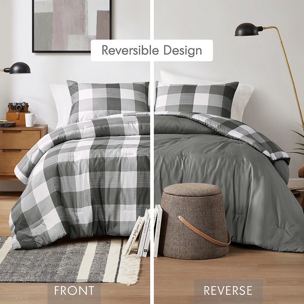 Jonah Charcoal Grey Plaid Check Printed Comforter Set Queen