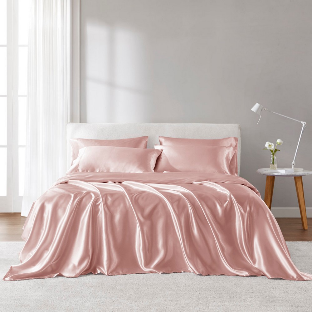 | Madison Park Essentials Cal King 1 Flat Sheet: 108x102" 4 King Pillowcases: 20x40"(4) 1 Fitted Sheet: 72x84"+14" 100% polyester Glam/Luxury Style Includes 6 Piece(s) MACHINE WASH COLD Fall asleep in smooth and luxurious comfort with our wrinkle-free satin sheets. These satin sheets are gentle on your skin and hair, while helping reduce damage causing friction, making this set an essential for your beauty self-care routine. Also included are 2 additional pillowcases to complete your room into full luxury. These sheets are also OEKO-TEX certified, meaning they do not contain any harmful substances or chemicals, ensuring quality comfort and wellness. |