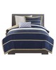 | Mi Zone Twin/Twin XL 1 Standard Sham: 20x26+2" 1 Duvet Cover: 68x90" 1 Decorative Pillow: 10x18" Duvet & Sham: 100% polyester microfiber printed, microfiber brushed fabric, solid reverse Pillow: poly cover and poly fill Casual Style Includes 3 Piece(s) MACHINE WASH COLD, GENTLE CYCLE, AND SEPARATELY. DO NOT BLEACH. TUMBLE DRY LOW, REMOVE PROMPTLY. DO NOT IRON. IF THERE IS NO FREE MOVEMENT IN THE WASHER OR DRYER, USE LARGE CAPACITY COMMERCIAL WASHER/DRYER. The Ashton Duvet Cover Set provides style and simplicity through the use of basic colors and stripes. The face of the duvet cover uses white, navy and khaki stripes a variety of widths while the shams pull the navy blue as the background and the khaki into slimmer stripes for a dramatic look. A blue and white diagonal striped decorative pillow completes the look of this set. This bedding set uses an antimicrobial treatment that provides built-in freshness protection, reducing the growth of odor causing bacteria to keep fabric lasting longer. Items in the set may come in a rolled or compressed packaging, which will need to be fluffed up or steam ironed before use to remove wrinkles. |