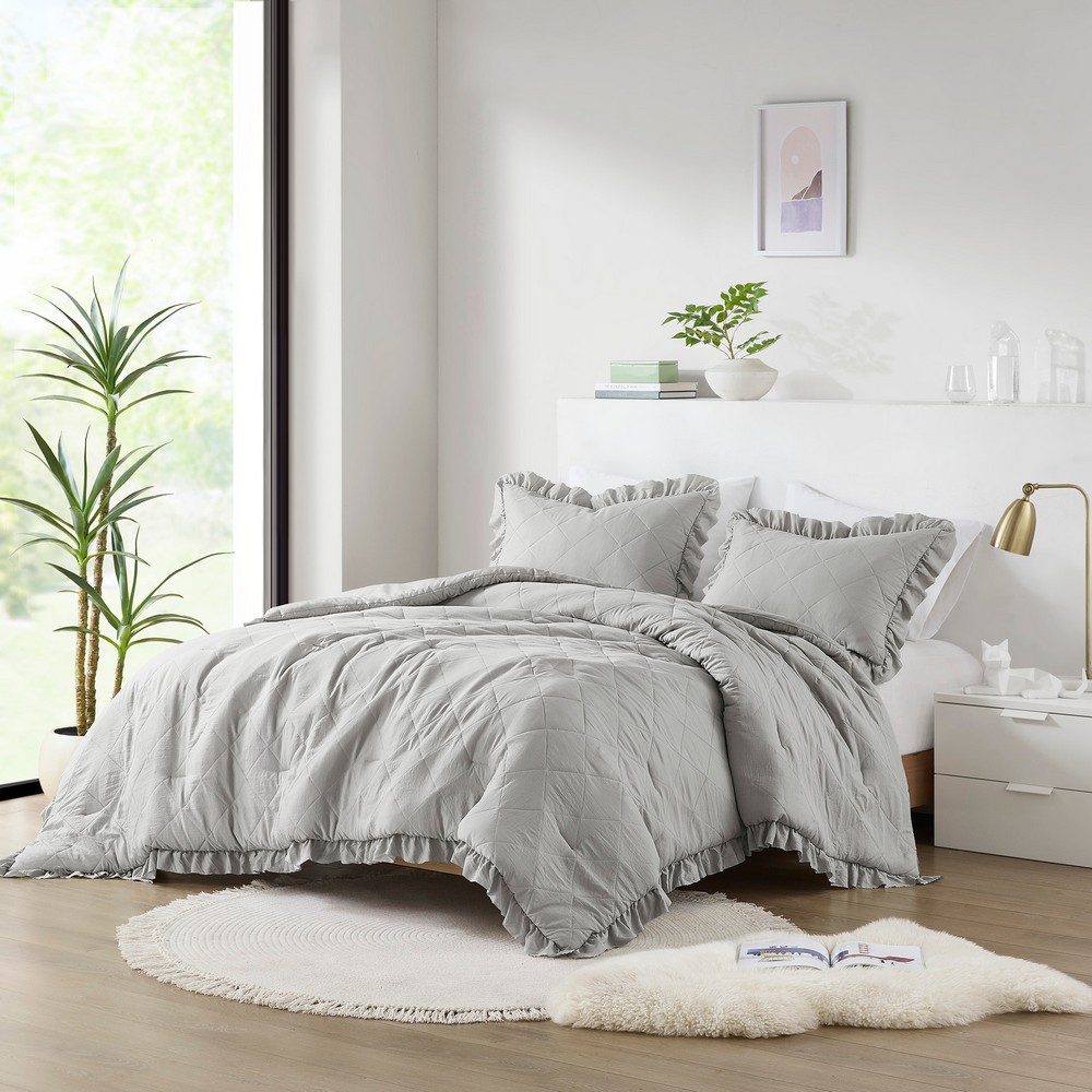 Phoebe Gray Diamond Quilted Ruffle Edge Comforter Set Twin