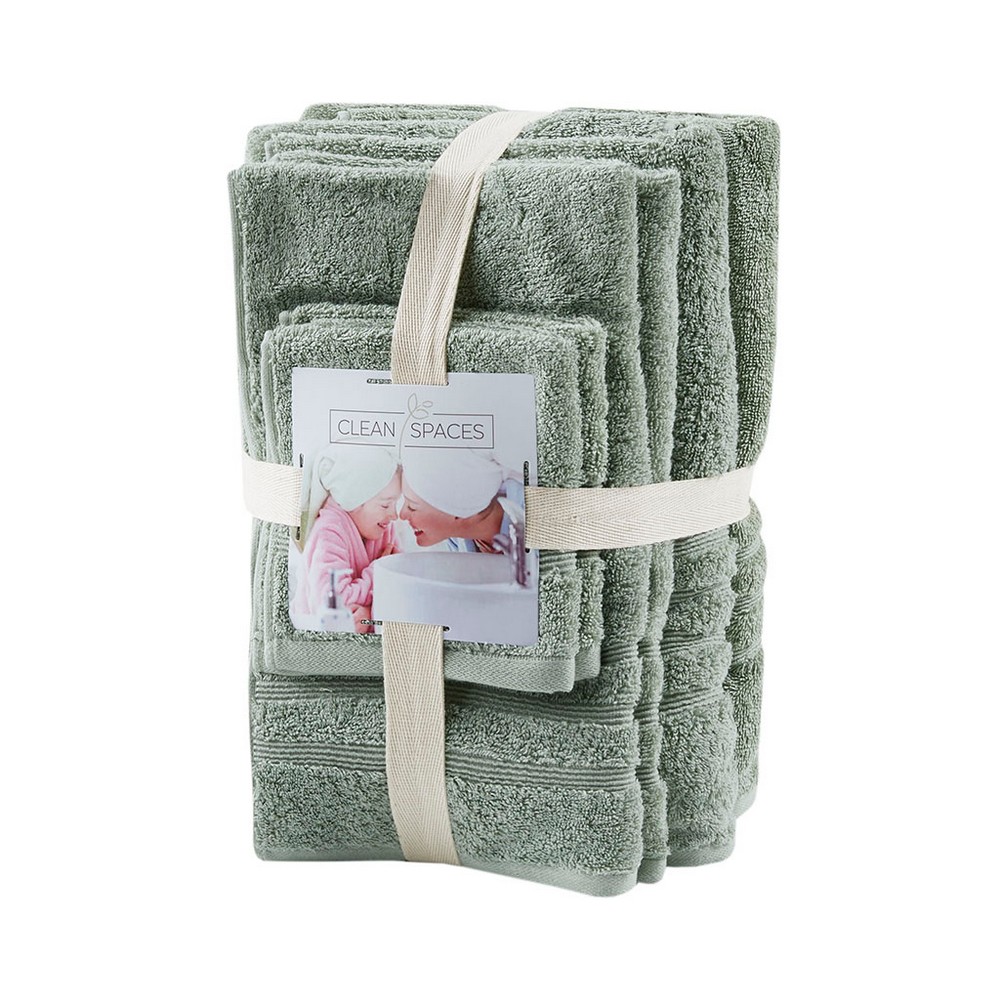| Clean Spaces 6-Piece 2 Bath Towels: 30"W x 54"L (2) 2 Hand Towels: 16"W x 26"L (2) 2 Wash Towels: 12"W x 12"L (2) 67% Regenerated Cotton & 33% Recycled Polyester Casual Style Includes 6 Piece(s) Wash before first use. Machine wash warm on gentle cycle with like colors. Only use non-chlorine bleach when needed. Avoid contact with products containing benzoyl peroxide. Do not wash with sharp items that may pull the towel fibers, such as zippers or hooks. To maintain the quality and performance of your towels, avoid the use of fabric softeners and dry sheets. Tumble dry low, remove promptly. Do not iron. Before use, simply shake towels to restore fluff and pile. Complete your bathroom decor with our Clean Spaces Nurture Sustainable Antimicrobial 6PC Towel Set. This eco-friendly solid green towel set is made from regenerated cotton and recycled polyester fibers safeguarding our resources for a better carbon footprint, while still featuring a 650gsm quality weight for a soft and plush feel. Each towel is finished with SILVADURâ„¢ antimicrobial treatment providing built in freshness protection, inhibiting growth of odor causing bacteria, and keeping linen newer, longer. Achieving the Made in Green by OEKO-TEX certified, meaning they do not include any harmful substances or chemicals while also using sustainable processes and socially responsible working conditions, for the best in quality comfort and wellness. Machine washable for easy care and active for multiple washes, this treatment delivers long-lasting durable odor protection performance, making it a superior addition to any bath time ritual. Set includes: 2 Bath (30"x54"), 2 Hand (16"x26"), and 2 Wash (12"x12") towels. |