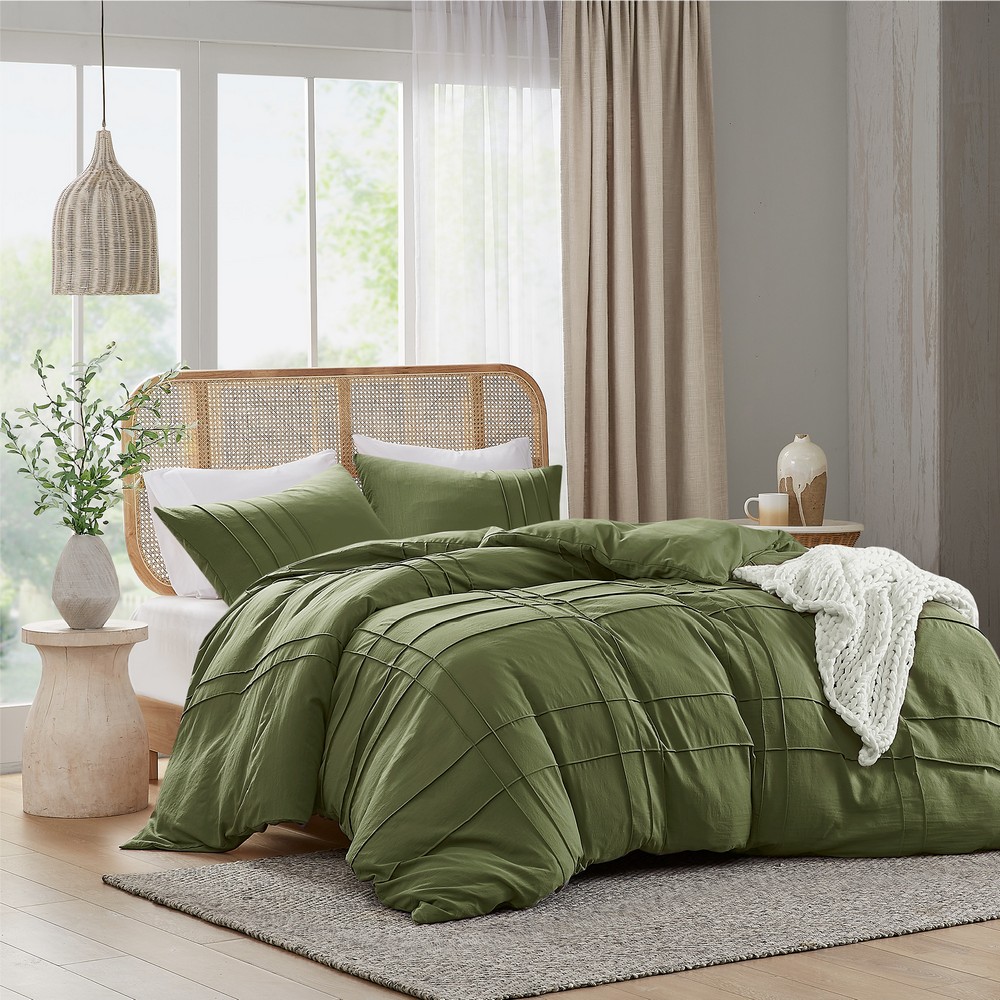 Porter Olive Green Soft Washed Pleated Duvet Cover Set King