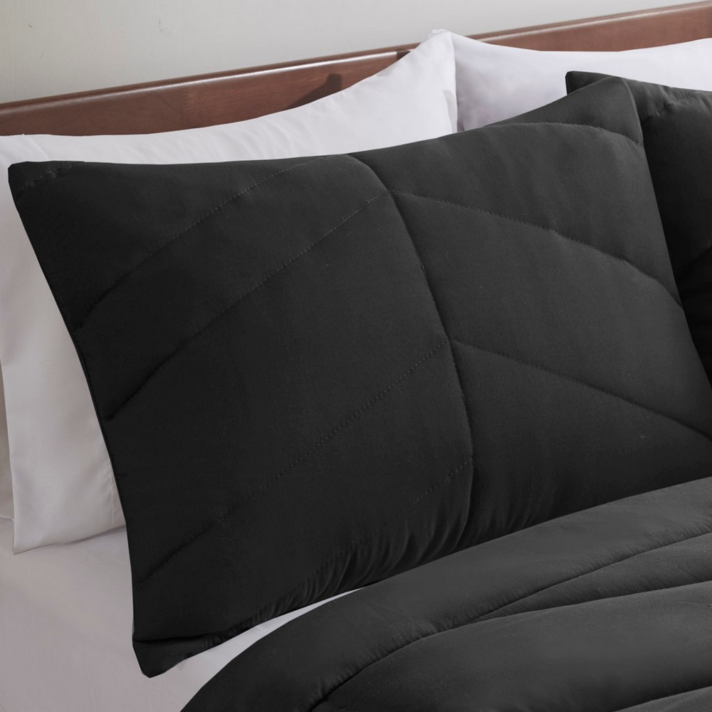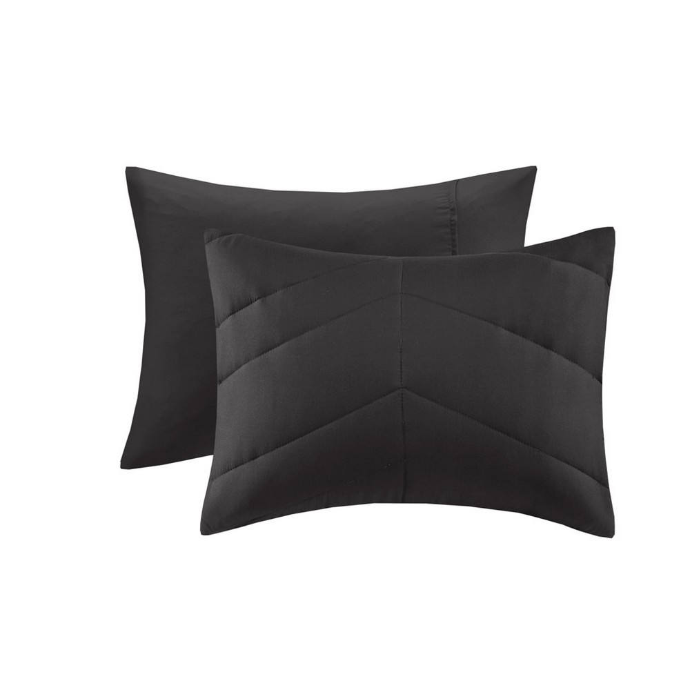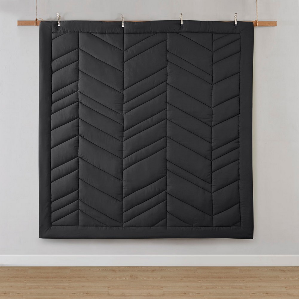 | Intelligent Design Twin/Twin XL 1 Comforter: 68"W x 90"L 1 Standard Sham: 20"W x 26"L Comforter/Sham: 100% polyester microfiber Fill: 100% polyester Sewn through quilting Modern/Contemporary Style Includes 2 Piece(s) Machine wash cold separately, gentle cycle. Do not bleach. Tumble dry low. Steam Iron Only. If there is no free movement in washer/dryer, use large capacity commercial washer/dryer. Experience the ultimate comfort and style with the Remy comforter set, which features a plush 350gsm polyester fill that will wrap you in softness. The soft, puffy comforter has a quilted chevron pattern that gives a modern flair, while the coordinating shams (1 in Twin/Twin XL) complete the bedding set. The polyester filling is also hypoallergenic, meaning it contains no allergens and is dust proof, so you can sleep comfortably. This bedding set is also OEKO-TEX certified and is machine washable for easy care. |