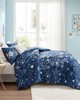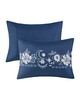 | Intelligent Design Twin/Twin XL 1 Duvet Cover: 68"W x 90"L 1 Standard Sham: 20"W x 26"L 1 Decorative Pillow: 16"W x 16"L Duvet/Sham: Face 100% polyester microfiber fabric printed. BACK microfiber solid. Anti-microbial treatment. Sham overlap opening at back. Duvet with button closure and 4 corner ties. Dec Pillow: Microfiber cover, polyester fill. Modern/Contemporary Style Includes 3 Piece(s) Machine wash cold separately, gentle cycle. Do not bleach. Tumble dry low. Do not iron. If there is no free movement in washer/dryer, use large capacity commercial washer/dryer. Spot clean pillows. The Intelligent Design Stella Celestial Duvet Cover Set offers a magically alluring update to your bedroom. The navy duvet cover features a celestial medallion print of stars, moons, and constellations with floral accents, for a stunning space look. Coordinating shams (1 in Twin/TwinXL) pair beautifully with the duvet cover, while a square decorative pillow adds a textured finishing touch to the space comforter set. An antimicrobial treatment provides built-in freshness protection, reduces growth of odor causing bacteria, and keeps the fabric newer, longer. Machine washable for easy care, this space-inspired duvet cover set may come in rolled or compressed packing and will need to be fluffed up. Use a steam iron to help remove wrinkles easier. A button closure at the foot end allows you to place a padded insert within the duvet cover and internal corner ties prevent it from shifting (Insert is NOT included). |