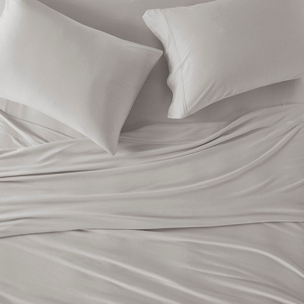 The all season jersey knit cotton blend sheet set is as comfortable as sleeping on your favorite tee. Unlike woven sheet set, this knit sheet set is easier to get into bed during cold weather or absorbent for summer. Choose from a variety of colors for comfort and style in your bedroom. Set includes 1 flat sheet, 1 fitted sheet and 2 pillowcases (1 in Twin size). Machine wash and tumble dry on low to prevent shrinkage. Fitted sheet fits up to 16 inches of mattress.