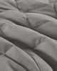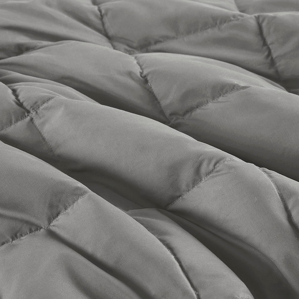Shell: down-proof microfiber, water repellent treatment Fill: 90% goose feather and 10% goose down End to end box quilting, self piping