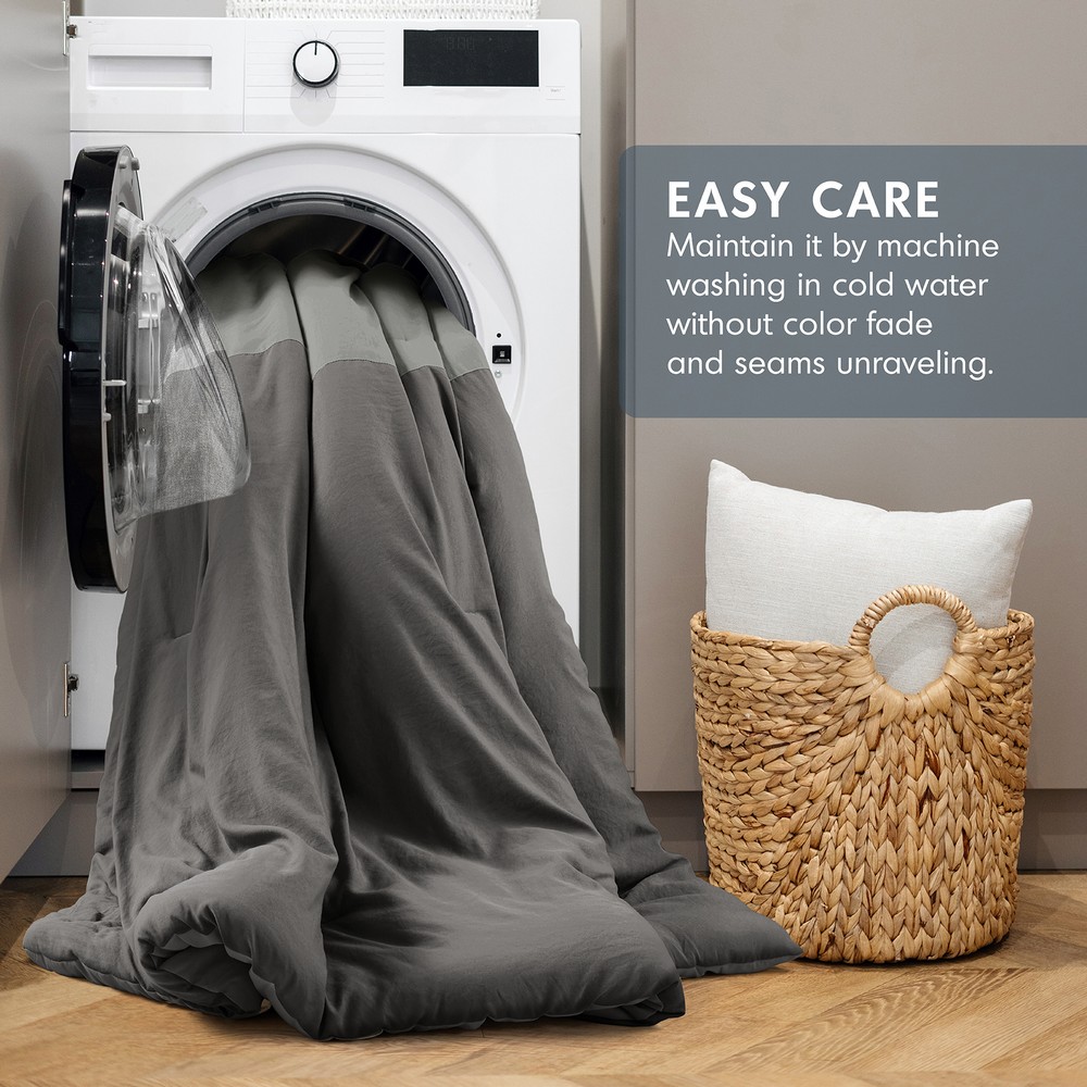 | Comfort Spaces King/Cal King 1 Comforter: 104"W x 90"L 2 King Shams: 20"W x 36"L + 2"D (2) Comforter/sham: Washed microfiber with pieced design on face, solid microfiber reverse, polyester fill. Modern/Contemporary Style Includes 3 Piece(s) Machine washable Indulge yourself in our silky soft, pre-washed bedding set displaying a charming color block design. Pieced together in two tones, including a solid reverse with a slightly weightier feel than your average comforter, it's sure to soothe your body in fluffy goodness and provide a rejuvenating night's sleep. Additionally, this set holds an Oeko-Tex certification, ensuring our dedication to safety and gentle, non-irritating skin contact. Modernize your room with our cleanly designed midweight comforter, fitting for any season. |