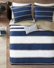 | Mi Zone Full/Queen 1 Decorative Pillow: 10x18" 1 Duvet Cover: 88x90" 2 Standard Shams: 20x26+2" (2) Duvet & Sham: 100% polyester microfiber printed, microfiber brushed fabric, solid reverse Pillow: poly cover and poly fill Casual Style Includes 4 Piece(s) MACHINE WASH COLD, GENTLE CYCLE, AND SEPARATELY. DO NOT BLEACH. TUMBLE DRY LOW, REMOVE PROMPTLY. DO NOT IRON. IF THERE IS NO FREE MOVEMENT IN THE WASHER OR DRYER, USE LARGE CAPACITY COMMERCIAL WASHER/DRYER. The Ashton Duvet Cover Set provides style and simplicity through the use of basic colors and stripes. The face of the duvet cover uses white, navy and khaki stripes a variety of widths while the shams pull the navy blue as the background and the khaki into slimmer stripes for a dramatic look. A blue and white diagonal striped decorative pillow completes the look of this set. This bedding set uses an antimicrobial treatment that provides built-in freshness protection, reducing the growth of odor causing bacteria to keep fabric lasting longer. Items in the set may come in a rolled or compressed packaging, which will need to be fluffed up or steam ironed before use to remove wrinkles. |