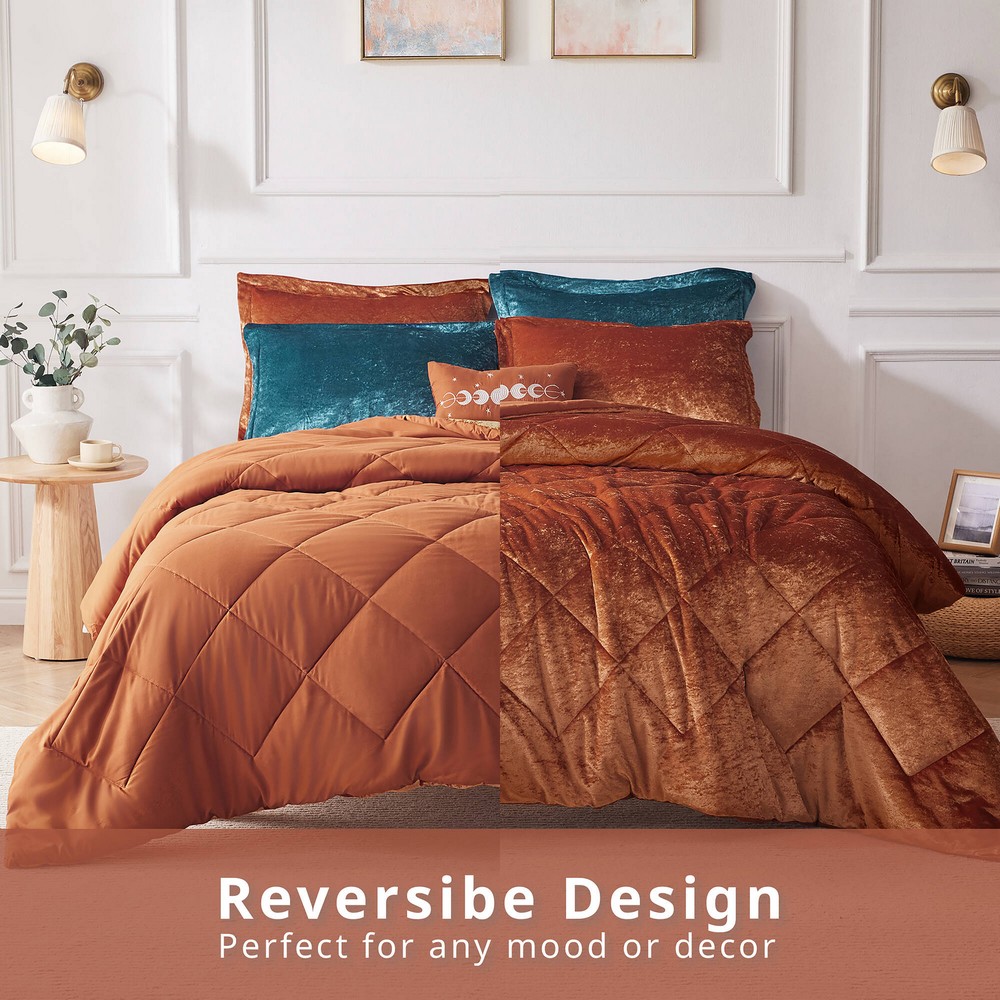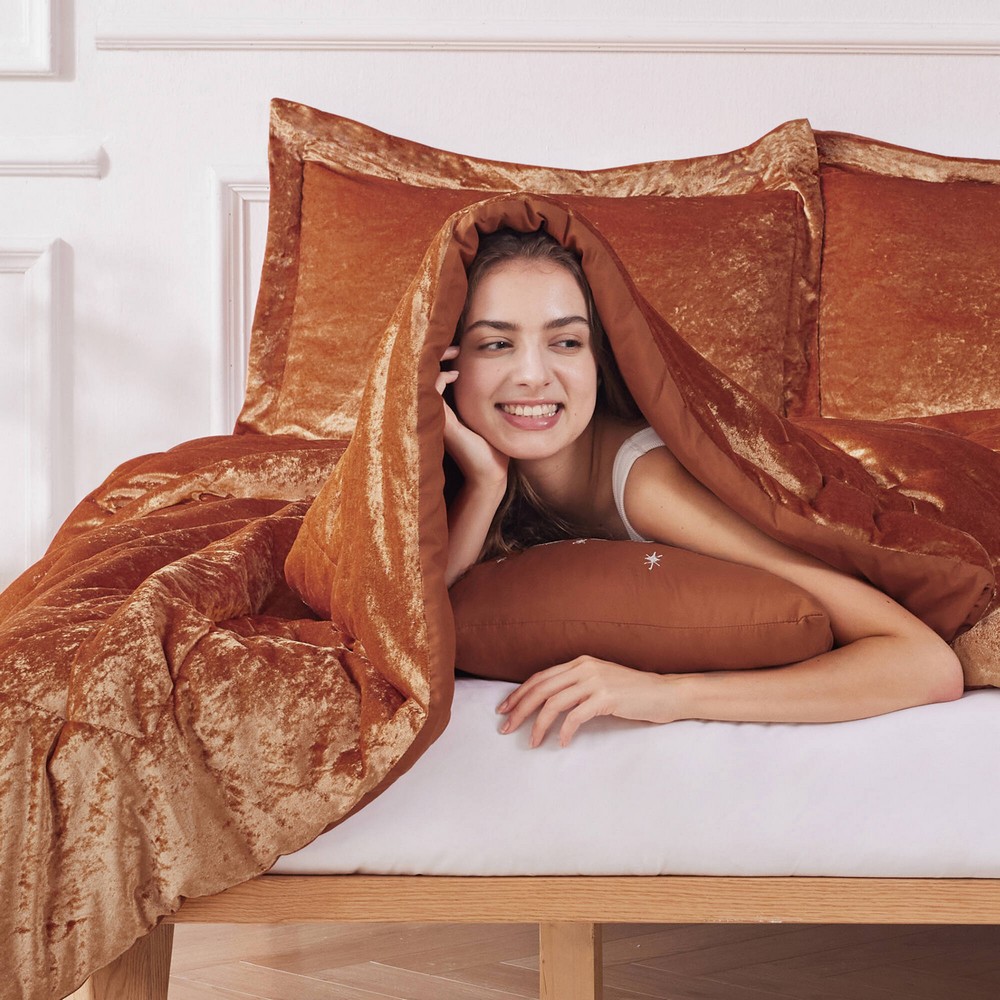 Create a luxuriously comfortable and lush bedroom space with the Intelligent Design Felicia Velvet Duvet Cover Set. The crushed velvet, rust duvet cover features a quilted diamond top that adds dimension to the glamorous look. Matching shams (1 for Twin/Twin XL Sizes) coordinate with the velvet duvet cover, while an oblong decorative pillow provides the perfect finishing touch. Machine washable for easy care, this velvet duvet cover set brings incredible softness and comfort with a glamorous flair to your bedroom decor. Button closures allow you to place a comforter insert within the duvet cover and internal corner ties help prevent it from shifting (Insert is NOT included).
