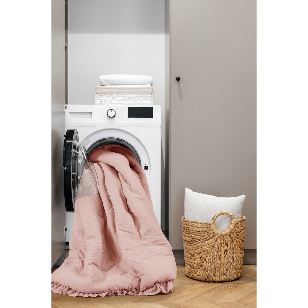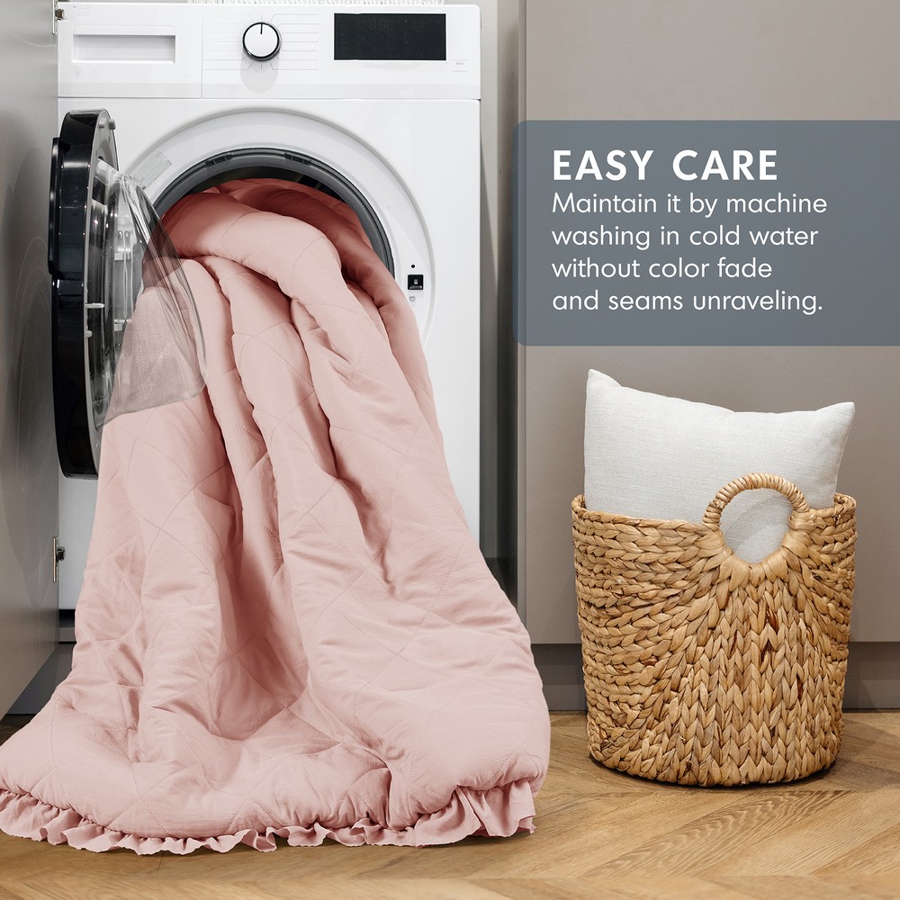 | Comfort Spaces Full/Queen 1 Comforter: 90"W x 90"L 2 Shams: 20"W x 26"L + 2"D (2) Comforter/sham: Washed microfiber with polyester filling quilted on face, solid microfiber reverse, comforter with total polyester fill. Vintage/Shabby Chic Style Includes 3 Piece(s) Machine washable Snuggle up to our soft pre-washed bedding set with top-quilted diamond patterning and ruffled edges. Designed with a weightier touch for that extra silky feel, our fluffy comforter features a cloud-like texture and a smooth solid reverse, tailored for lasting comfort, keeping you cozy during those long, tiring nights. Additionally, this set holds an Oeko-Tex certification, ensuring our dedication to safety and gentle, non-irritating skin contact. Putting a unique spin on a tried-and-tested design, our lavish midweight comforter set will ensure you never want to leave your bed. |