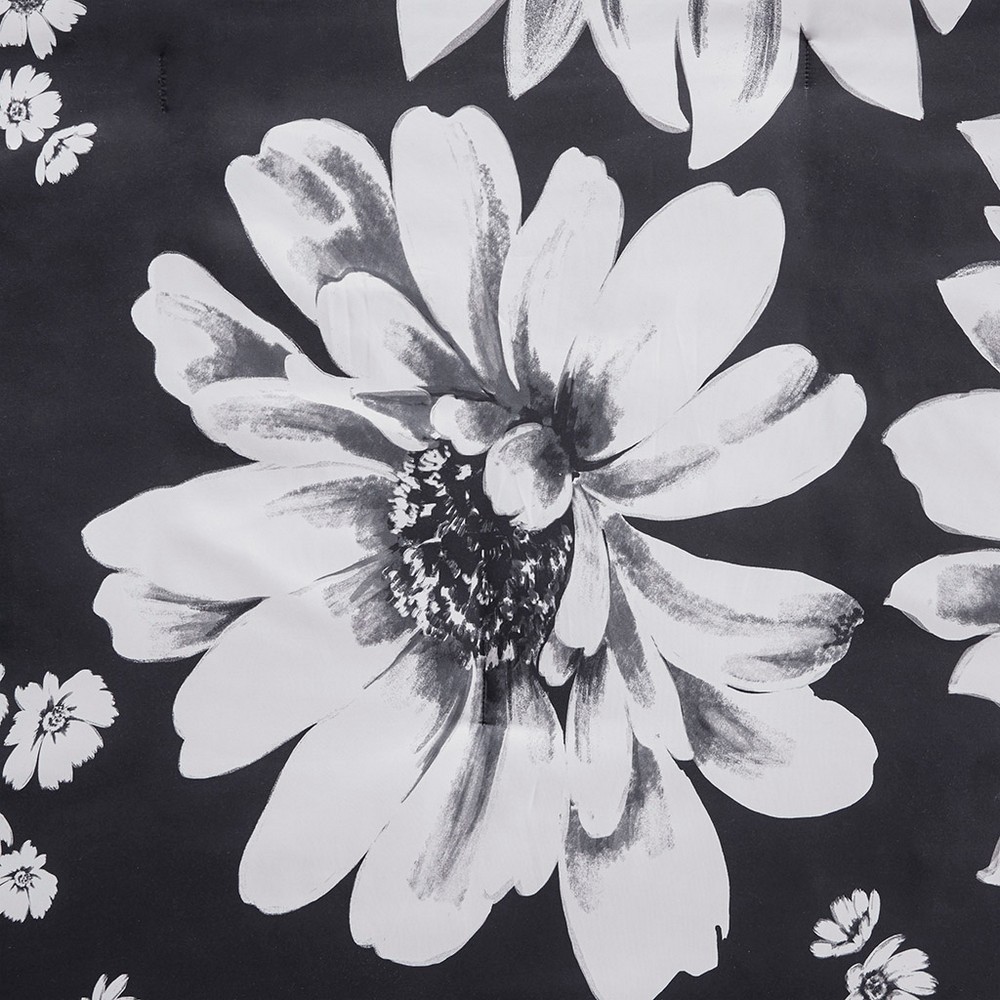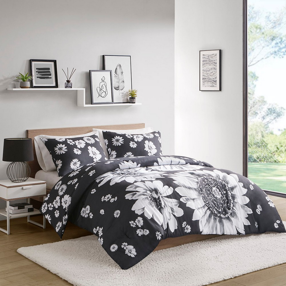 | Intelligent Design Full/Queen 1 Comforter: 90"W x 90"L 2 Standard Shams: 20"W x 26"L (2) Comforter/Sham: 100% polyester microfiber. Anti-microbial treatment. Sham overlap opening at back Filling: 100% polyester Casual Style Includes 3 Piece(s) Machine wash cold separately, gentle cycle. Do not bleach. Tumble dry low. Steam Iron Only. If there is no free movement in washer/dryer, use large capacity commercial washer/dryer. The Maude comforter set features a large scale floral design and reverses to a smaller scale floral design for 2 looks in 1. This eye-catching black and white comforter gives your bedroom a bold and dramatic update. The coordinating shams (1 in Twin/Twin XL) repeat the smaller scale floral design to complete the bedding set. The hypoallergenic polyester comforter filling contains no allergens and is treated to be dustproof. This machine washable comforter set also features antimicrobial treatment which keeps the fabric long lasting. |