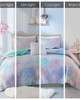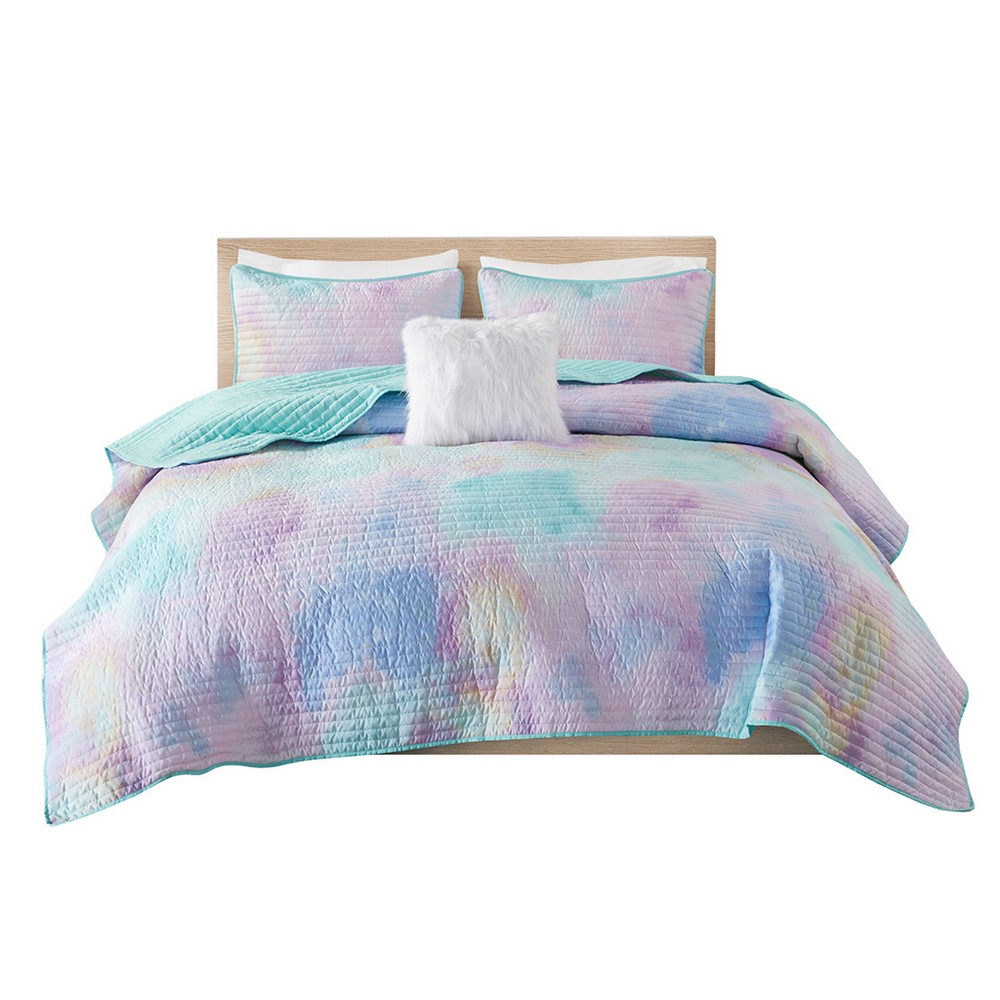 | Intelligent Design Full/Queen 1 Quilt: 88"W x 90"L 2 Standard Shams: 20"W x 26"L (2) 1 Throw Pillow: 14"W x 14"L Quilt/Sham: Printed soft brushed microfiber face, solid microfiber reverse. Anti-microbial treatment. Filling: Polyester, channel quiltling Pillow: Faux fur cover, polyester fill Modern/Contemporary Style Includes 4 Piece(s) Machine wash cold separately, gentle cycle. Do not bleach. Tumble dry low. Do not iron. If there is no free movement in washer/dryer, use large capacity commercial washer/dryer. Spot clean pillow. Bring a splash of beautiful colors to your bedroom with the Intelligent Design Cassiopeia Watercolor Tie Dye Printed Quilt Set. This quilt features a watercolor tie dye print on channel quilting for a colorful dreamy look, and reverses to a coordinating aqua color. The 2 matching shams (1 in Twin/TwinXL) also have piped edges that pair perfectly with the quilt, and a square fur decorative pillow adds a chic textural touch. The hypoallergenic polyester quilt filling contains no allergens and is treated to be dustproof so you can sleep comfortably. This tie dye quilt set is also OEKO-TEX certified, featuring antimicrobial treatment which keeps the fabric fresh and long lasting. |