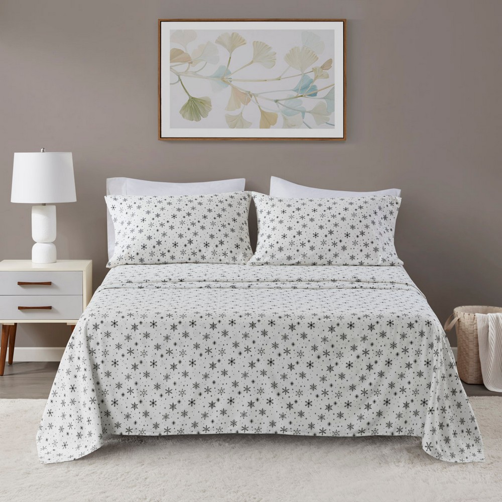 | Beautyrest Cal King 1 Flat Sheet: 108"W x 104"L 1 Fitted Sheet: 72"W x 84"L + 16"D 2 King Pillowcases: 20"W x 40"L (2) 100% Cotton Flannel, 4" self hem stitch on flat sheet and pillow case, Elastic all around fitted sheet Casual Style Includes 4 Piece(s) Machine Washable Sleep in warm and ultra-soft comfort with the Beautyrest Oversized Cotton Flannel Sheet 4 piece sheet set. This flannel sheet set features superior brushed fabric for incredible softness and oversized dimensions to fit premium mattresses. Pre-shrunk for a guaranteed comfort and secure fit. This sheet set is also OEKO-TEX certified, meaning it does not contain any harmful substances or chemicals to ensure quality comfort and wellness. |