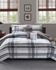 | Intelligent Design Twin/Twin XL 1 Comforter: 68"W x 90"L 1 Standard Sham: 20"W x 26"L + 1"D 1 Decorative Pillow: 12"W x 16"L 1 Decorative Pillow: 16"W x 16"L Comforter/Sham: 100% polyester 85gsm microfiber, printed, solid microfiber reverse, 200 gram polyester filling Pillow: polyester cover and polyester filling Casual Style Includes 4 Piece(s) Comforter and Sham: Machine wash Pillow: Spot Clean Bring casual comfort to your bedroom with the Intelligent Design Rudy Plaid Comforter Set. Featuring bold black and grey hues, a hand-drawn plaid design is printed on the soft comforter and 2 shams (1 in Twin/TwinXL) for a handsome and cozy look. A solid grey reverse provides a rich touch of color to complement the top of the bed, while 2 decorative pillows with fabric manipulation and embroidery complete the bedding set. Machine washable for easy care, this plaid comforter set is made from ultra-soft microfiber for a comfortable feel and a trendy look. This plaid comforter set uses antimicrobial treatment that provides built-in freshness protection, reducing the growth of odor causing bacteria to keep fabric lasting longer. |