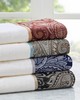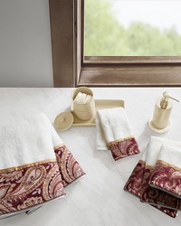 | Madison Park 6-Piece 2 Bath Towels: 27"W x 52"L (2) 2 Hand Towels: 16"W x 28"L (2) 2 Fingertip Towels: 12"W x 18"L (2) 100% cotton terry jacquard towel 550gsm Traditional Style Includes 6 Piece(s) Wash before first use. Machine wash gentle cycle with like color in cold water. Only use non-chlorine bleach when needed. Do not wash with sharp items that may pull the towel fibers, such as zippers or hooks. To maintain the quality and performance of your towels, avoid the use of fabric softeners and dry sheets. Tumble dry low, remove promptly. Cool iron if necessary. Fold towels neatly and store in a dry ventilated place. Before use, simply shake towels to restore fluff and pile. Add a sophisticated style to your bathroom with our Madison Park Aubrey 6 Piece Jacquard Towel Set. This towel set features a pieced design with a woven paisley jacquard hem, in soft burgendy and taupe hues, for an elegant and decorative touch. These cotton towels are also OEKO-TEX certified, meaning they do not contain any harmful substances, ensuring quality comfort and wellness. Made from 100% cotton terry, this towel set is incredibly soft, absorbent, and machine washable for easy care. Place these jacquard cotton towels in your bathroom to add the perfect finishing touches to your traditional style decor. Coordinating shower curtains and rugs are available and sold separately for a complete look. Set includes: 2 standard 27x52" bath towels, 2 standard 16x28" hand towels, and 2 standard 12x18" fingertip towels. |