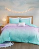 The Mi Zone Glimmer Metallic Glitter Printed Reversible Comforter Set brings a lively and colorful update to your bedroom. This ultra-soft reversible comforter features an ombre pattern of aqua, blush, and pastel purple that flips to a solid aqua on the reverse. Shams (1 for Twin Sizes) come in a variety of colors that coordinate with the comforter, while brilliant sparkles and glitter adorn the contemporary comforter set all-over, creating fun and magical look. An oblong pillow provides the perfect finishing touch to complete the comforter set. Machine washable for easy care, this printed reversible ombre comforter set is sure to brighten your bedroom with a whimsical flair. Sham varieties include aqua, blush, and pastel purple colors; only 1 color variety in each bedding set. This bedding set also uses an antimicrobial treatment that provides built-in freshness protection, reducing the growth of odor causing bacteria to keep fabric lasting longer. Items in the set may come in a rolled or compressed packaging, which will need to be fluffed up or steam ironed before use to remove wrinkles.